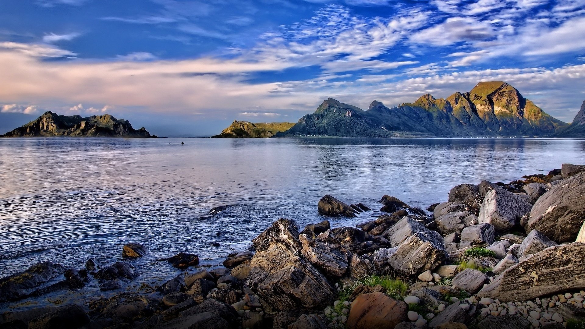 ![Голубое море горы небо]()