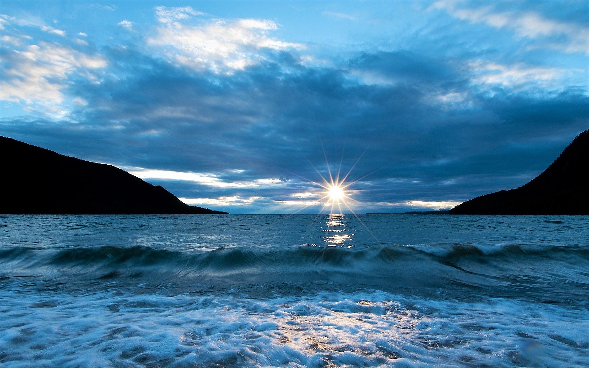 ![Рассвет море горы]()