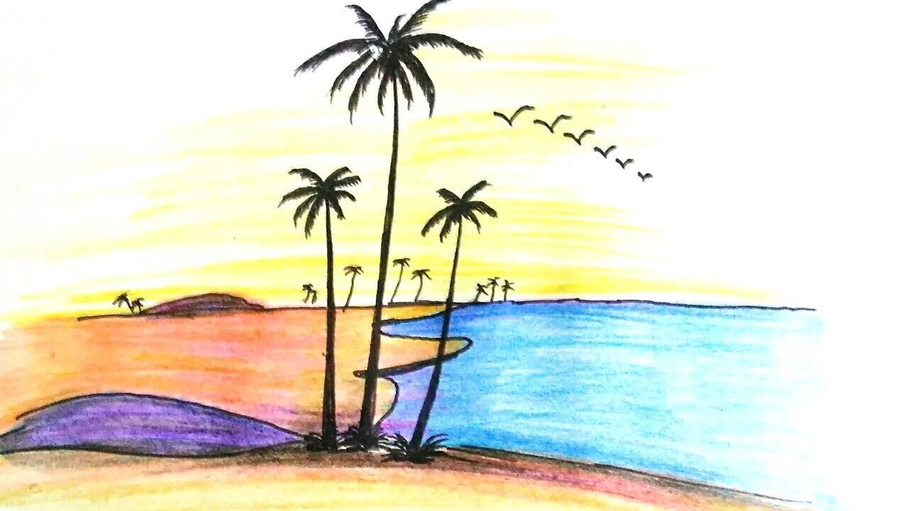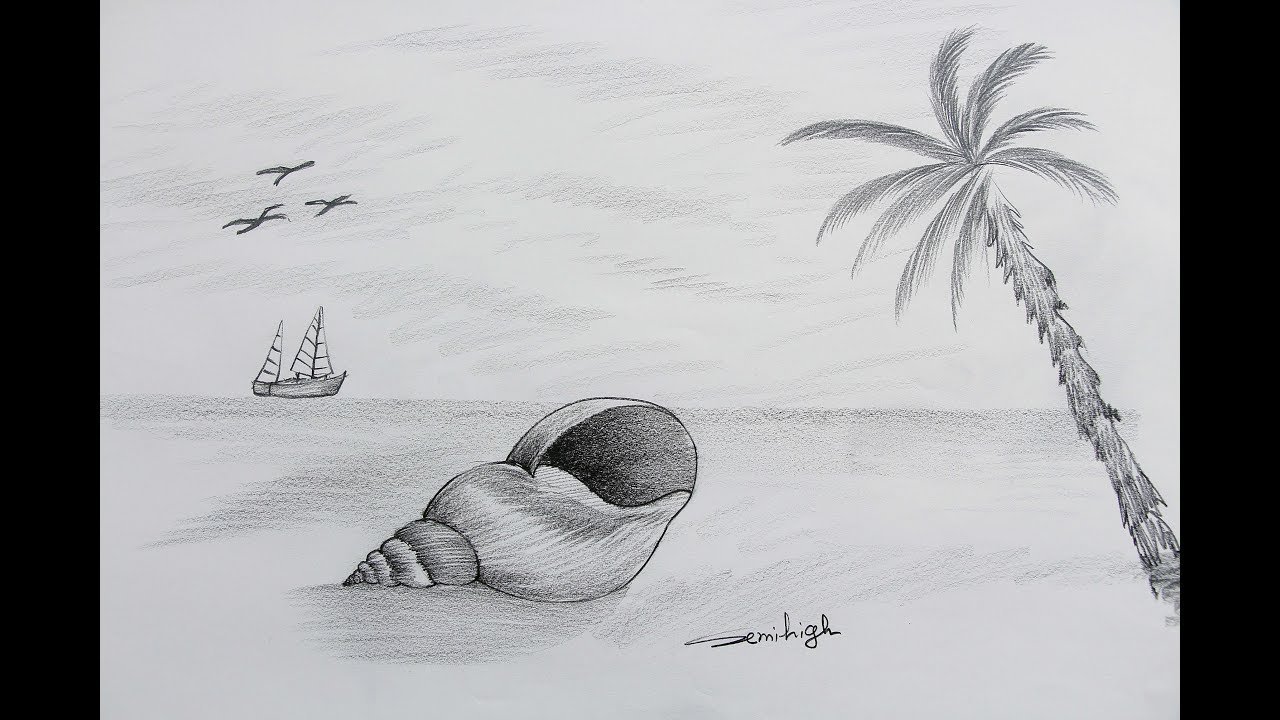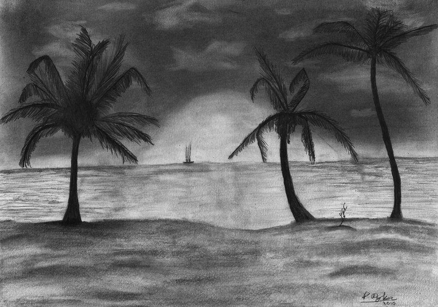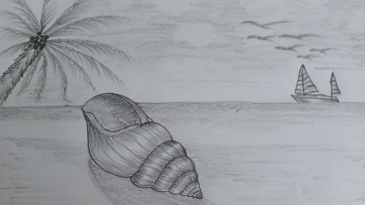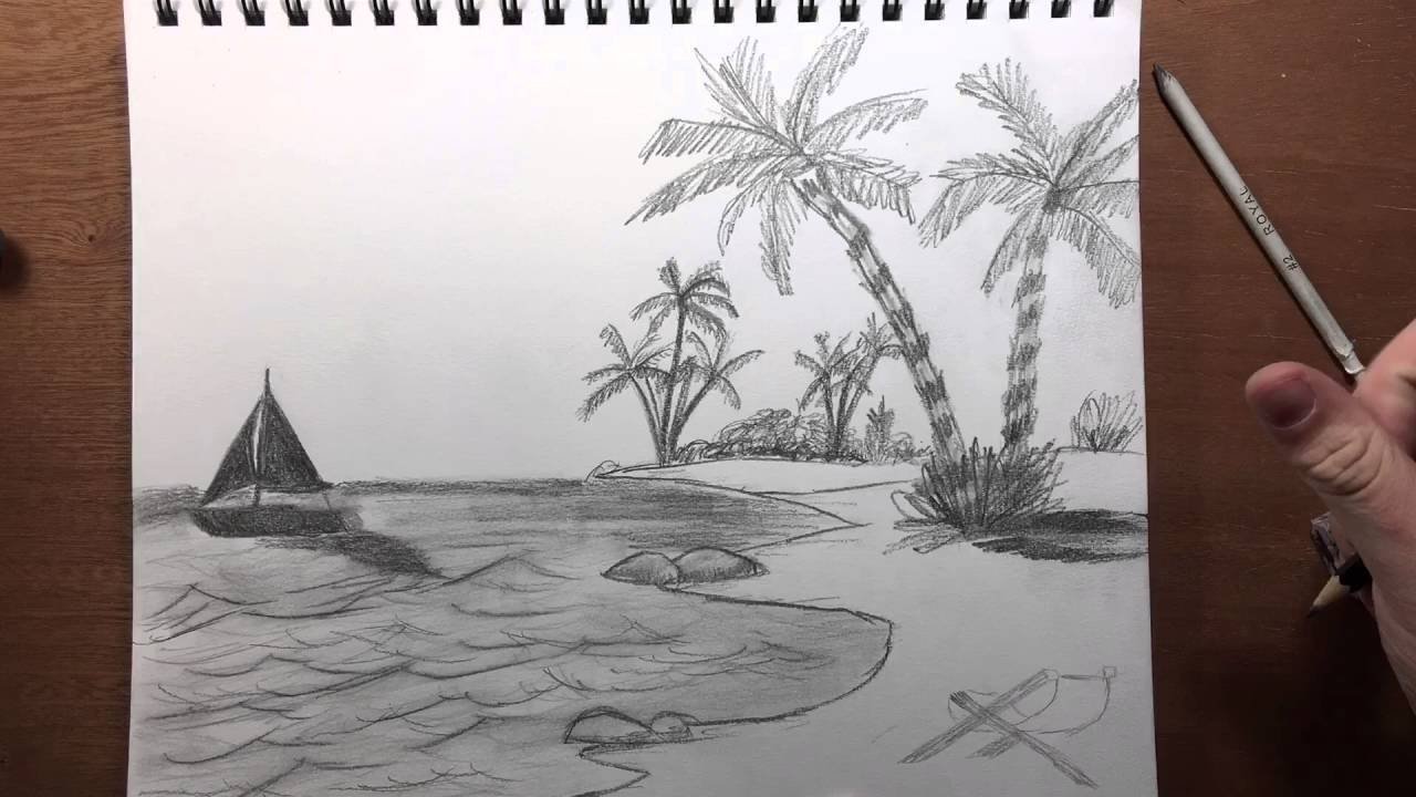 Пейзаж пляжа и моря рисунок карандашом