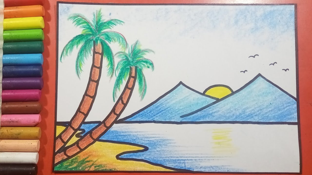 Детский пейзаж моря карандашами