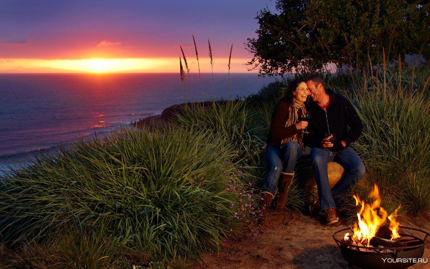 ![Костер на берегу моря на закате]()