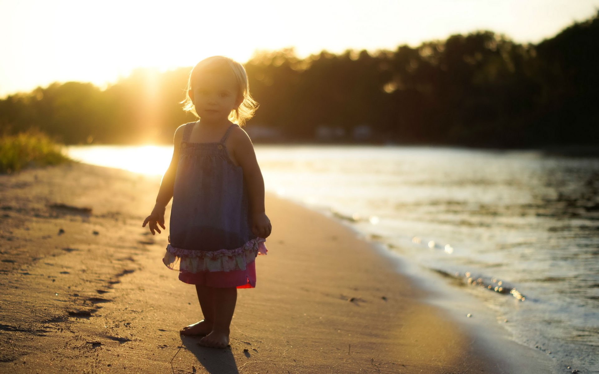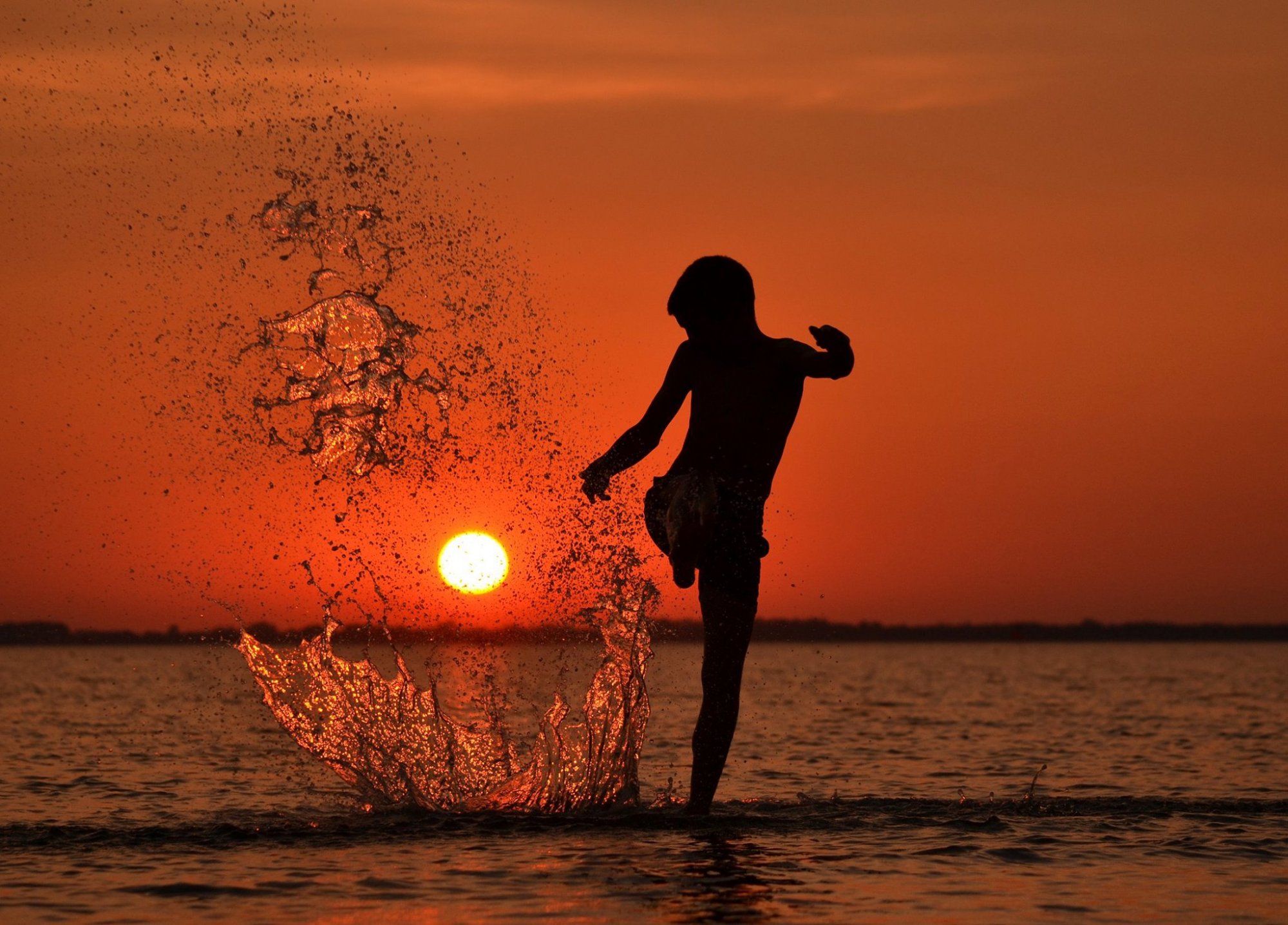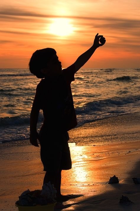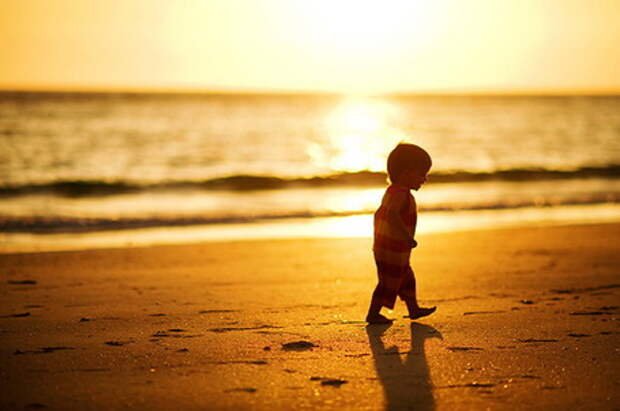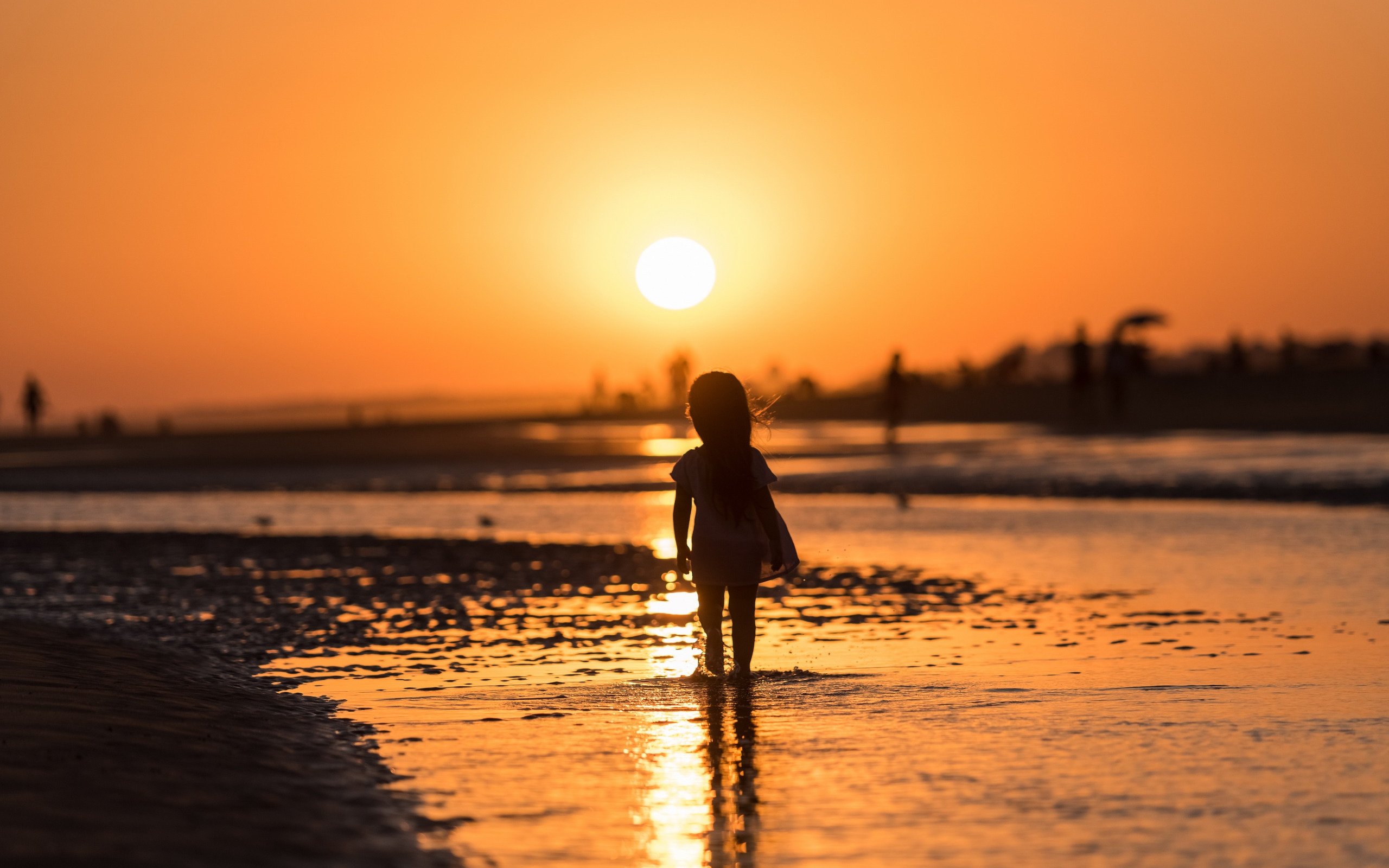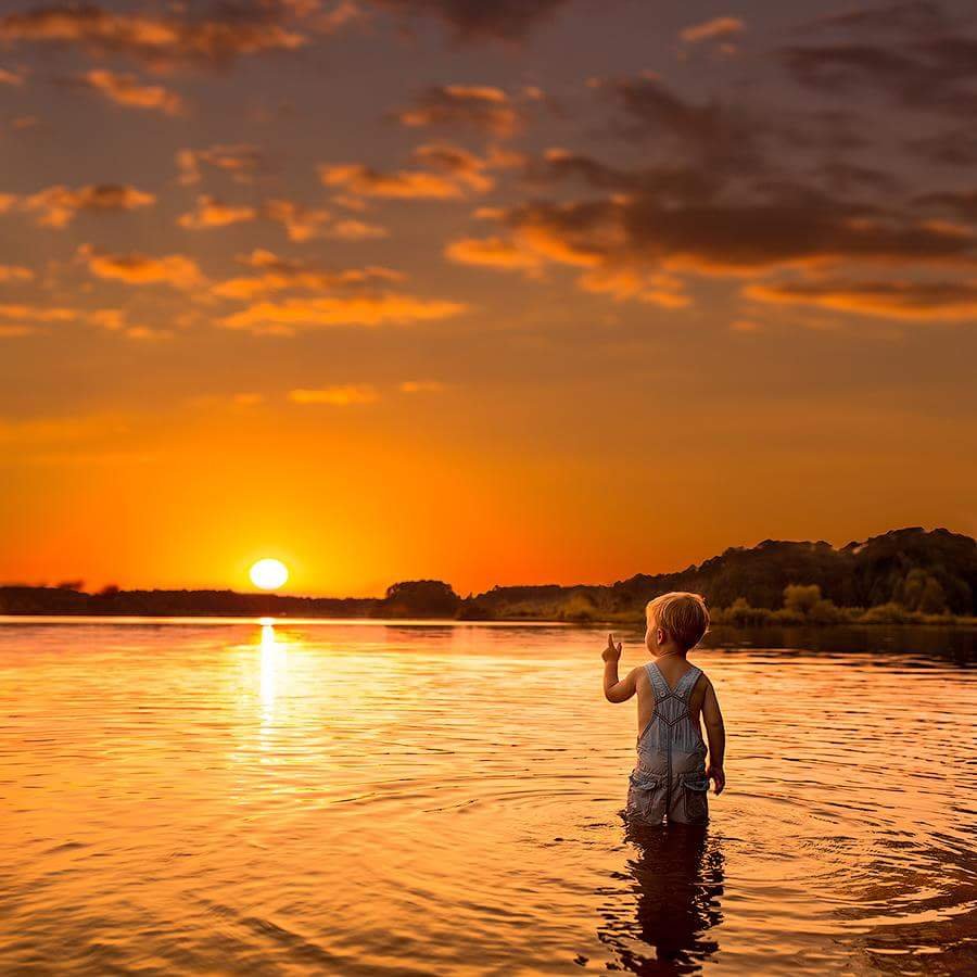 На картинке изображен ребенок, стоящий на берегу моря во время заката. На фоне красивого оранжевого неба и отражения солнца на воде создается умиротворенная атмосфера. Ребенок внимательно смотрит на заходящее солнце, словно погруженный в размышления или восторг. Этот момент запечатлен на фотографии, передавая тепло и спокойствие всем, кто смотрит на это прекрасное природное явление.