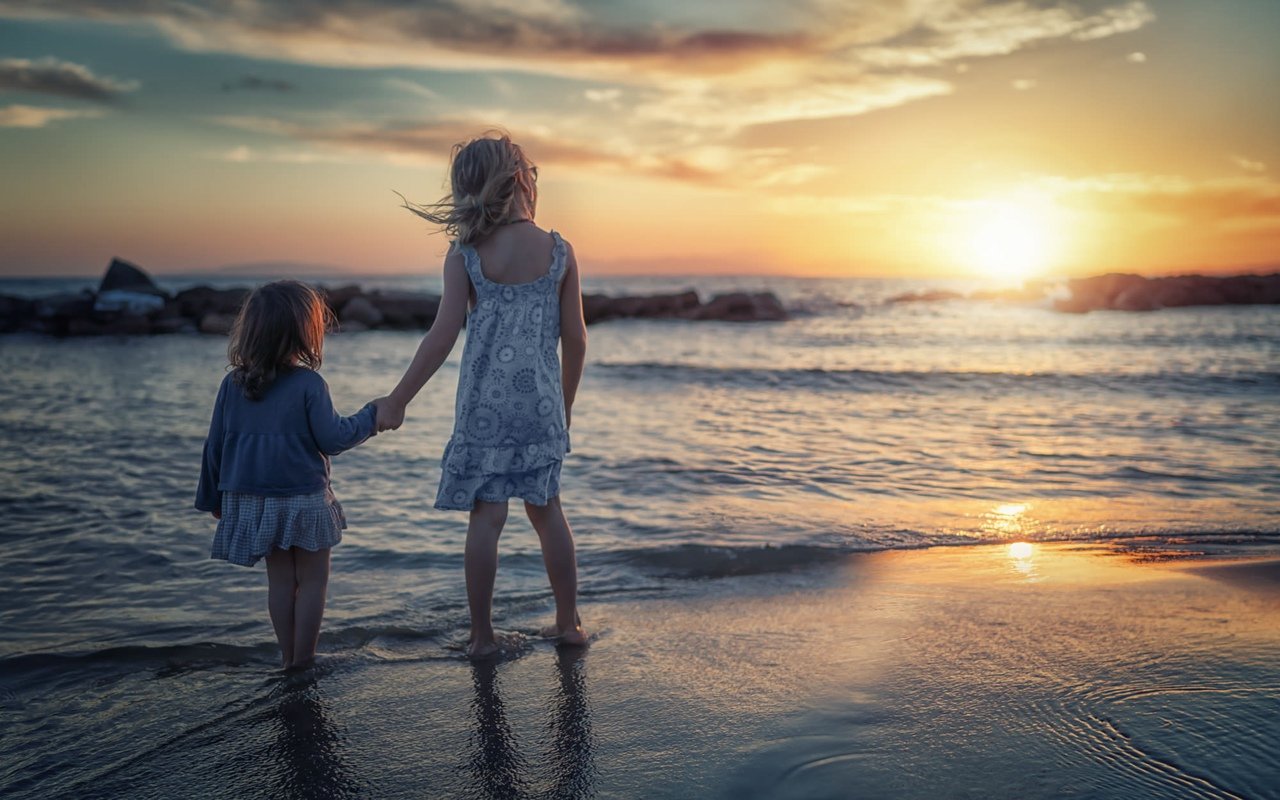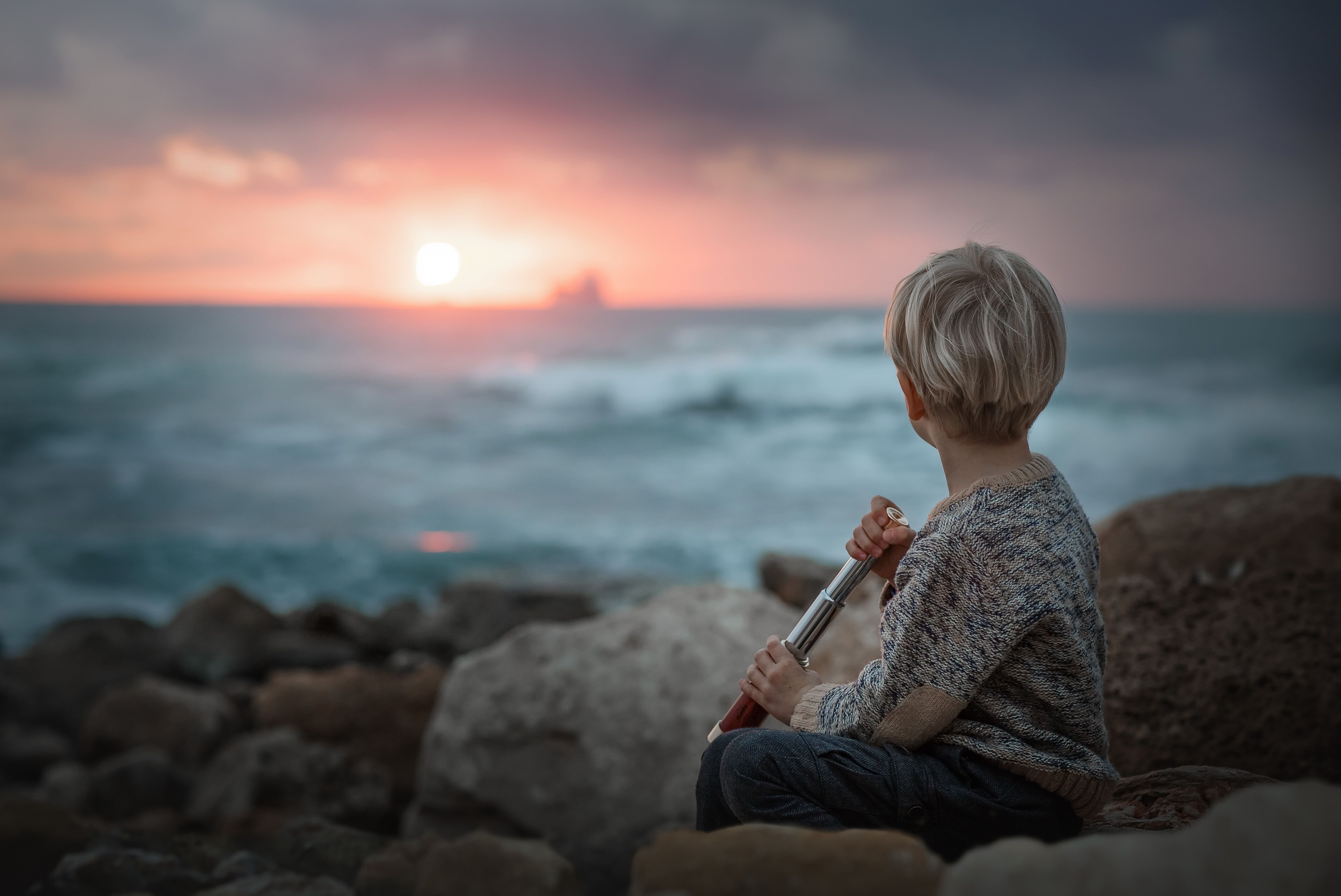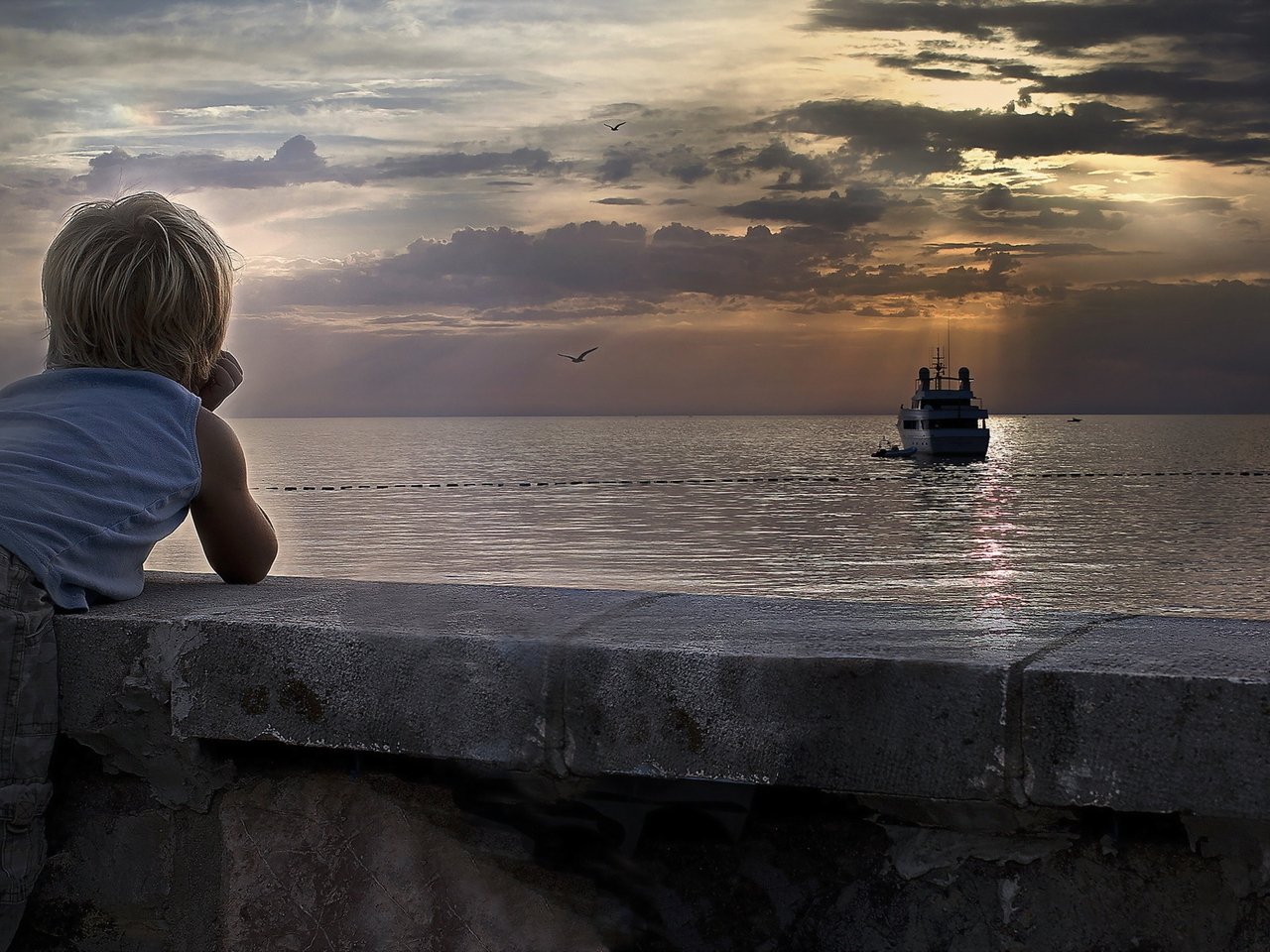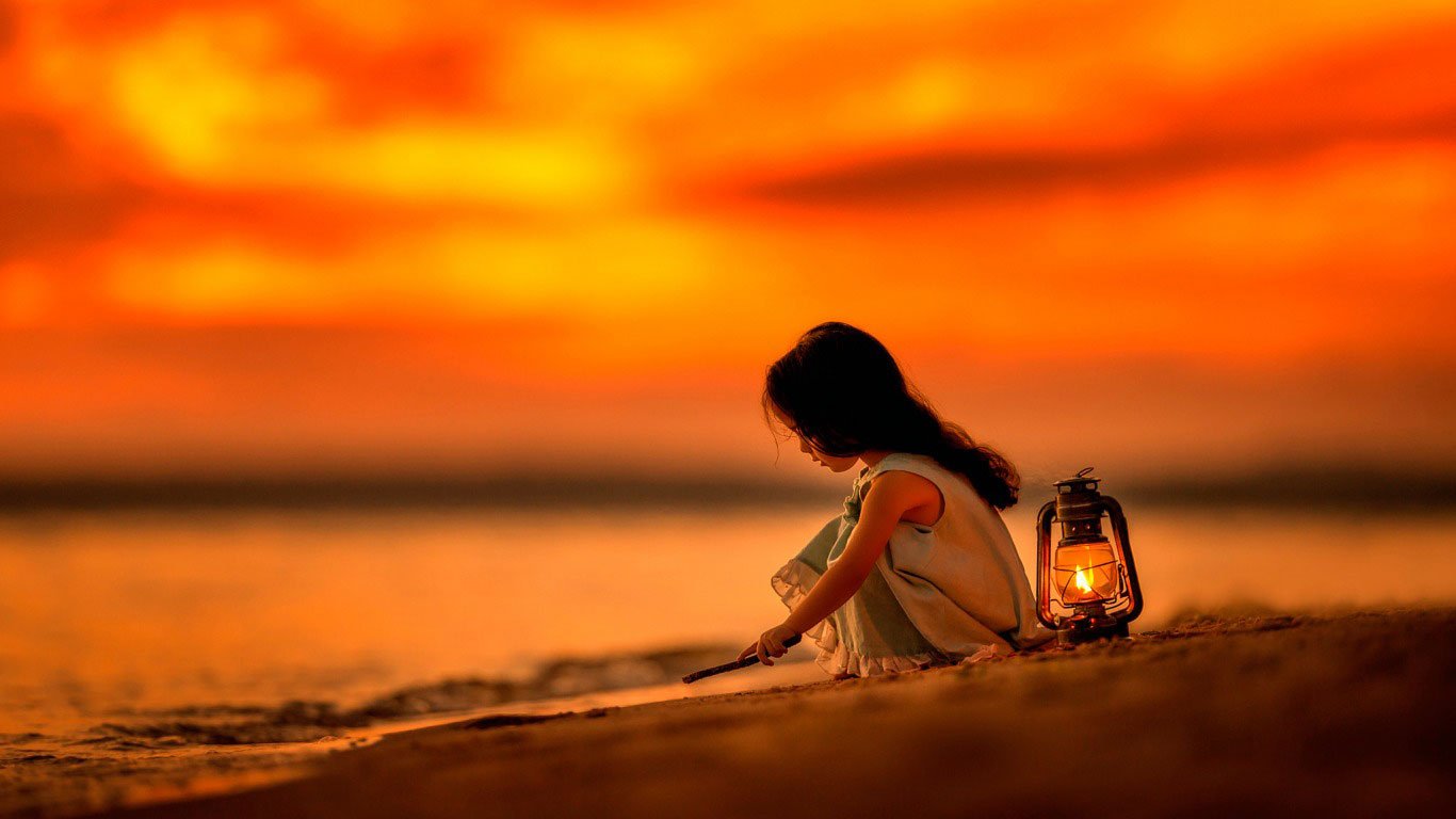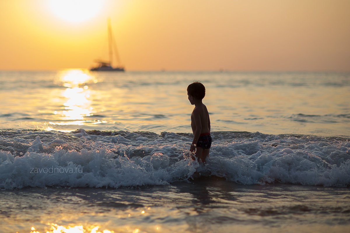На картинке изображен ребенок, стоящий на берегу моря во время заката. На фоне красивого оранжевого неба и отражения солнца на воде создается умиротворенная атмосфера. Ребенок внимательно смотрит на заходящее солнце, словно погруженный в размышления или восторг. Этот момент запечатлен на фотографии, передавая тепло и спокойствие всем, кто смотрит на это прекрасное природное явление.