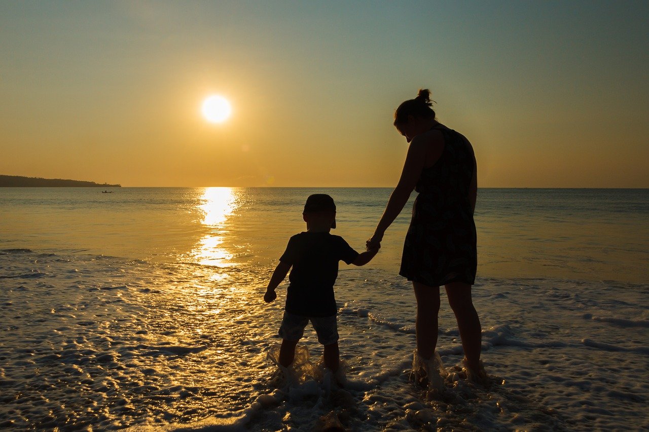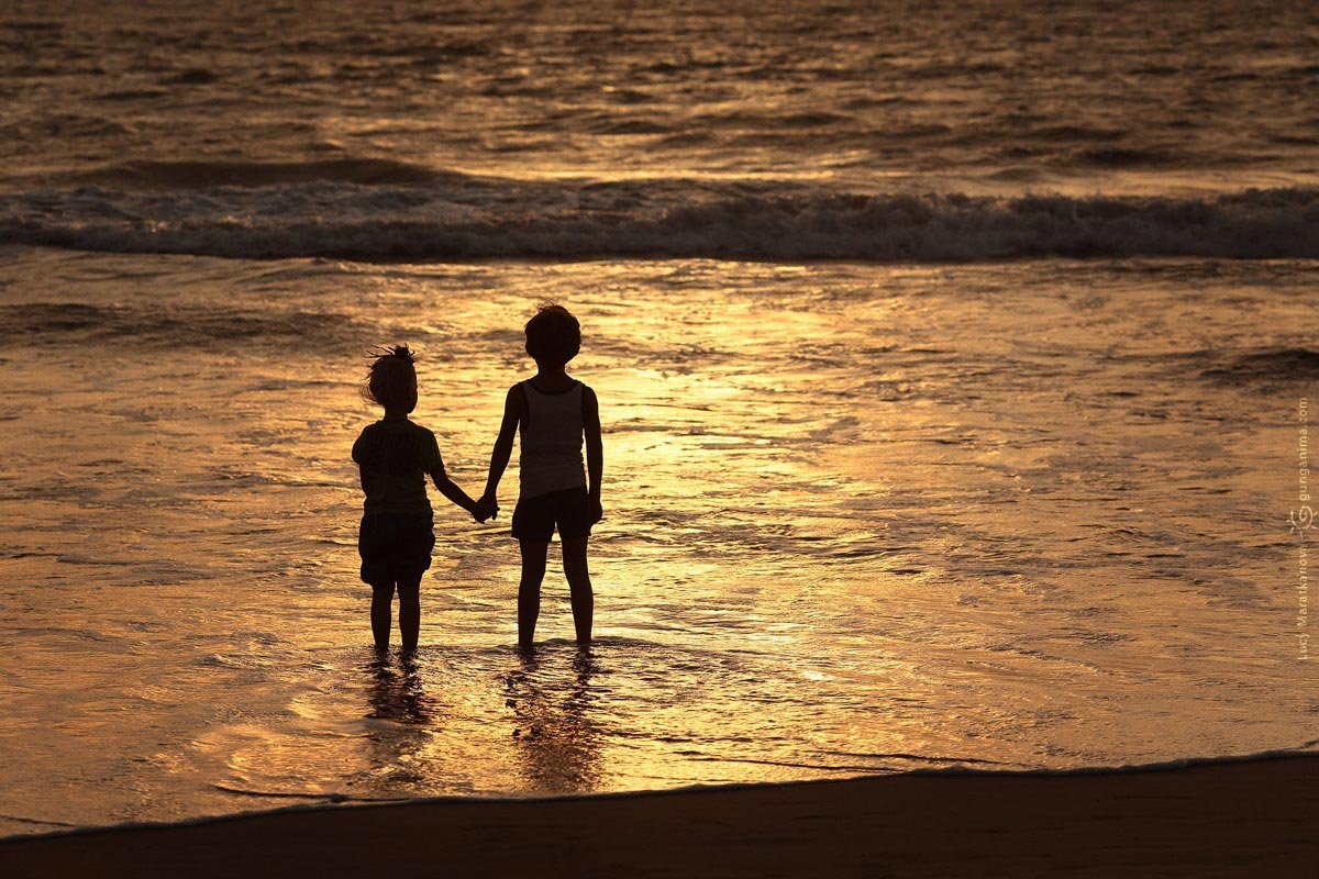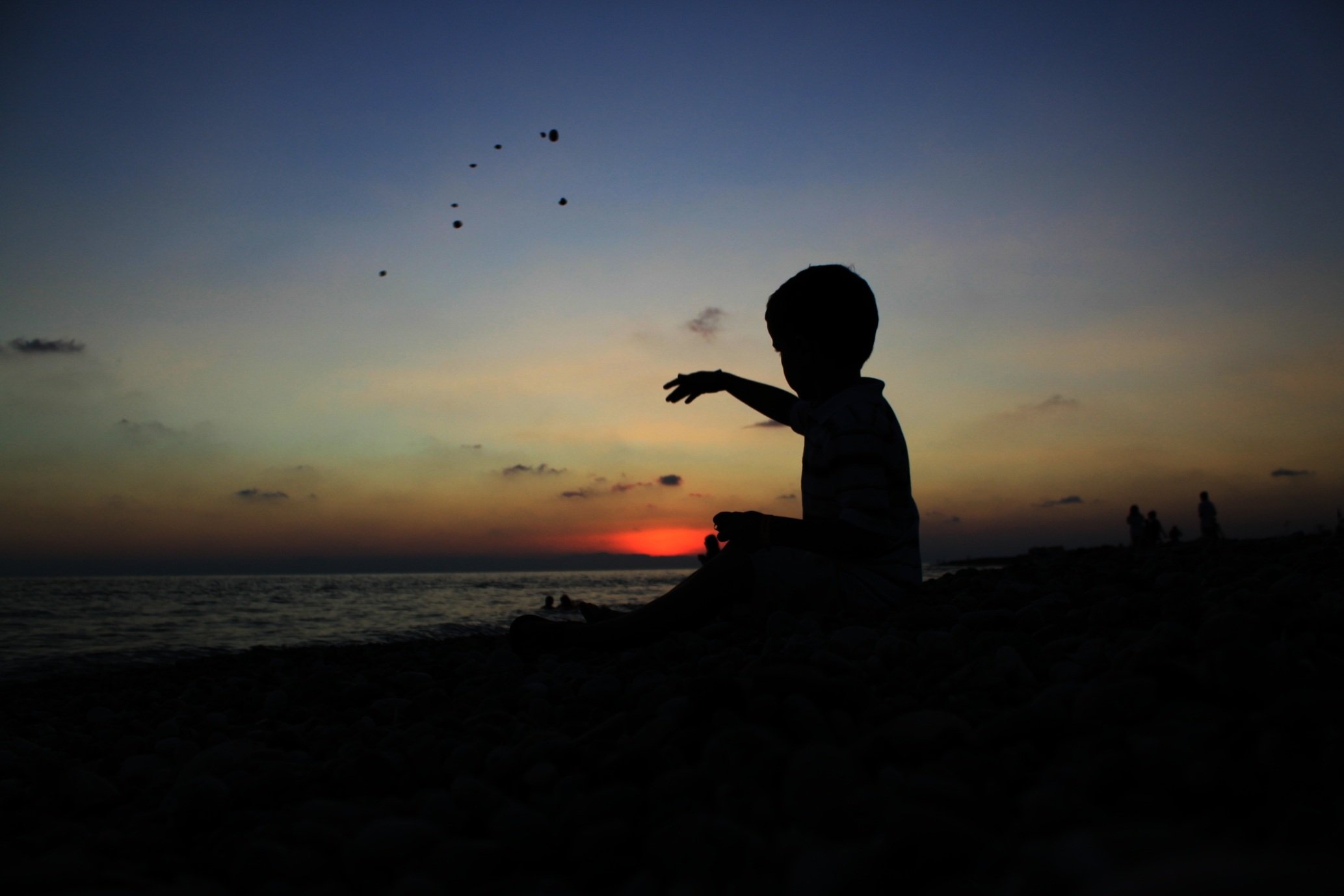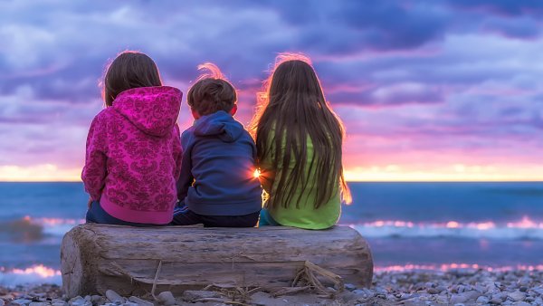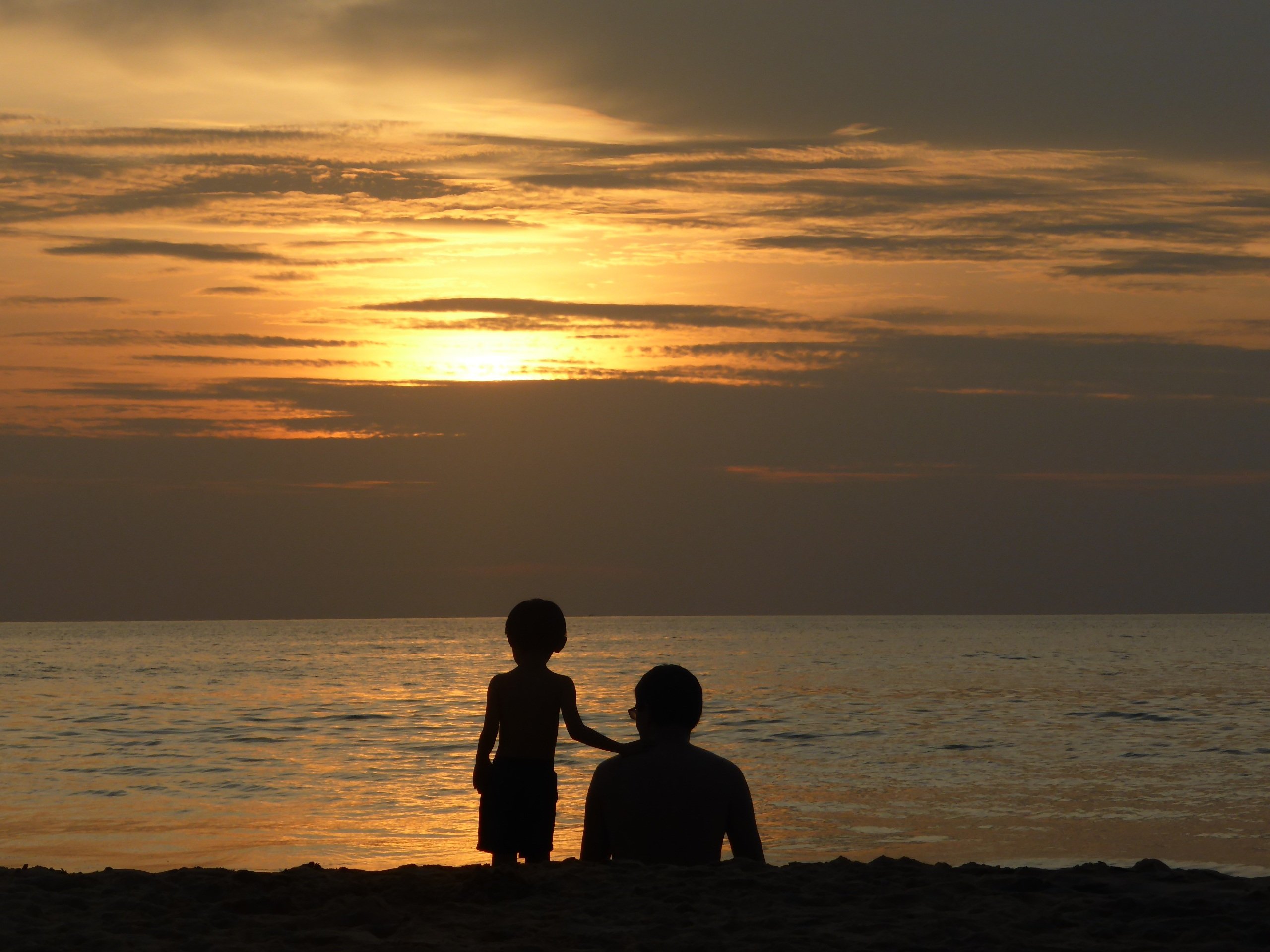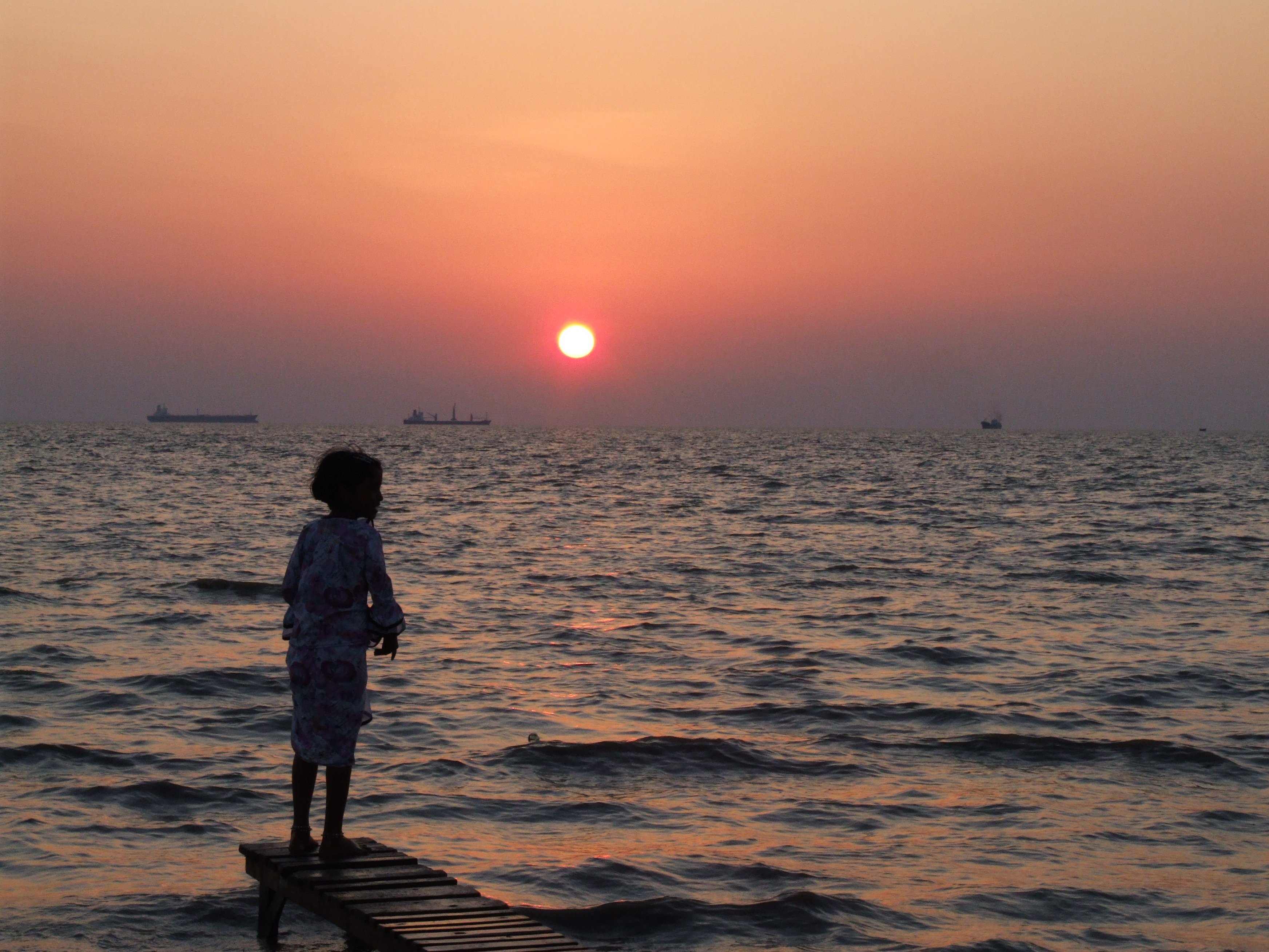 На картинке изображен ребенок, стоящий на берегу моря во время заката. На фоне красивого оранжевого неба и отражения солнца на воде создается умиротворенная атмосфера. Ребенок внимательно смотрит на заходящее солнце, словно погруженный в размышления или восторг. Этот момент запечатлен на фотографии, передавая тепло и спокойствие всем, кто смотрит на это прекрасное природное явление.