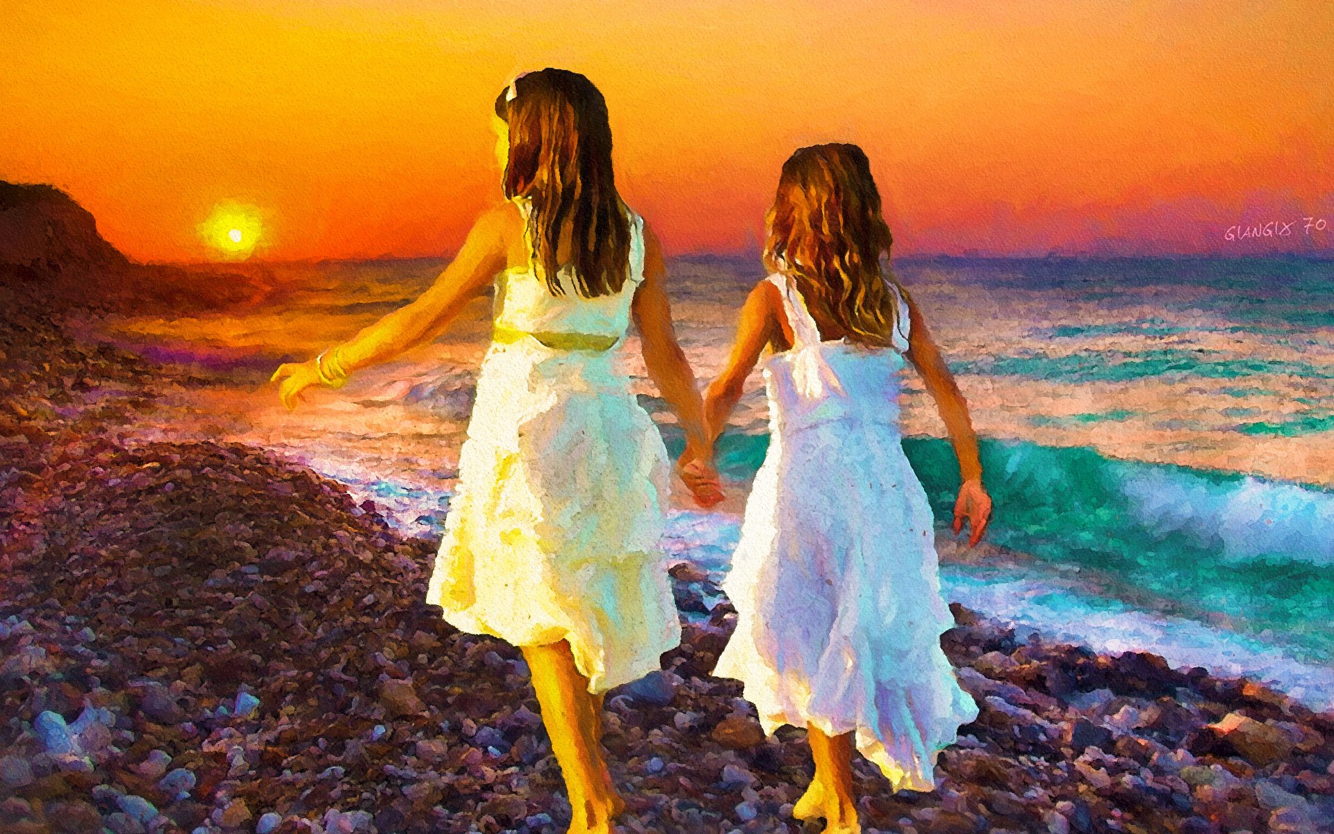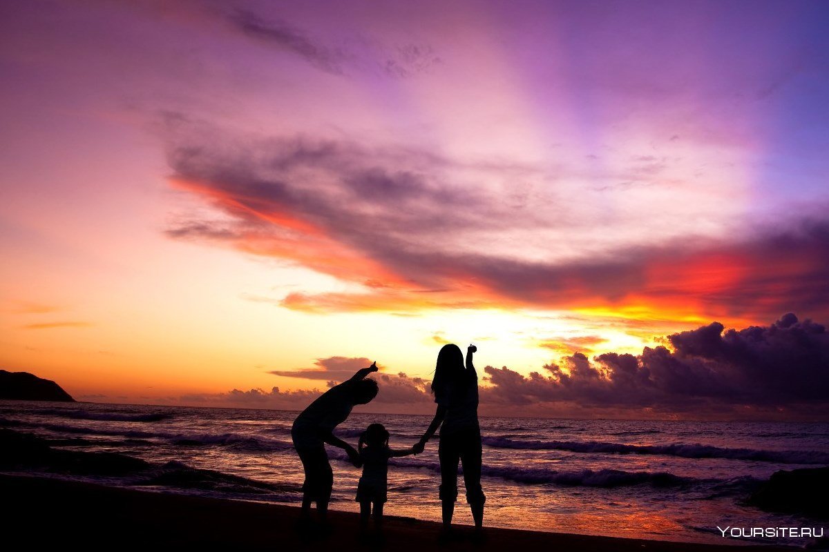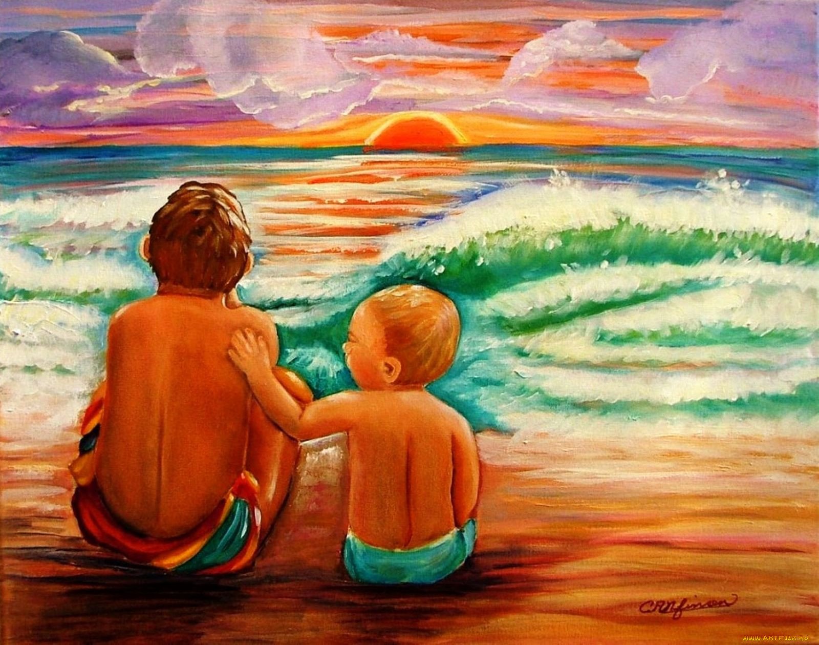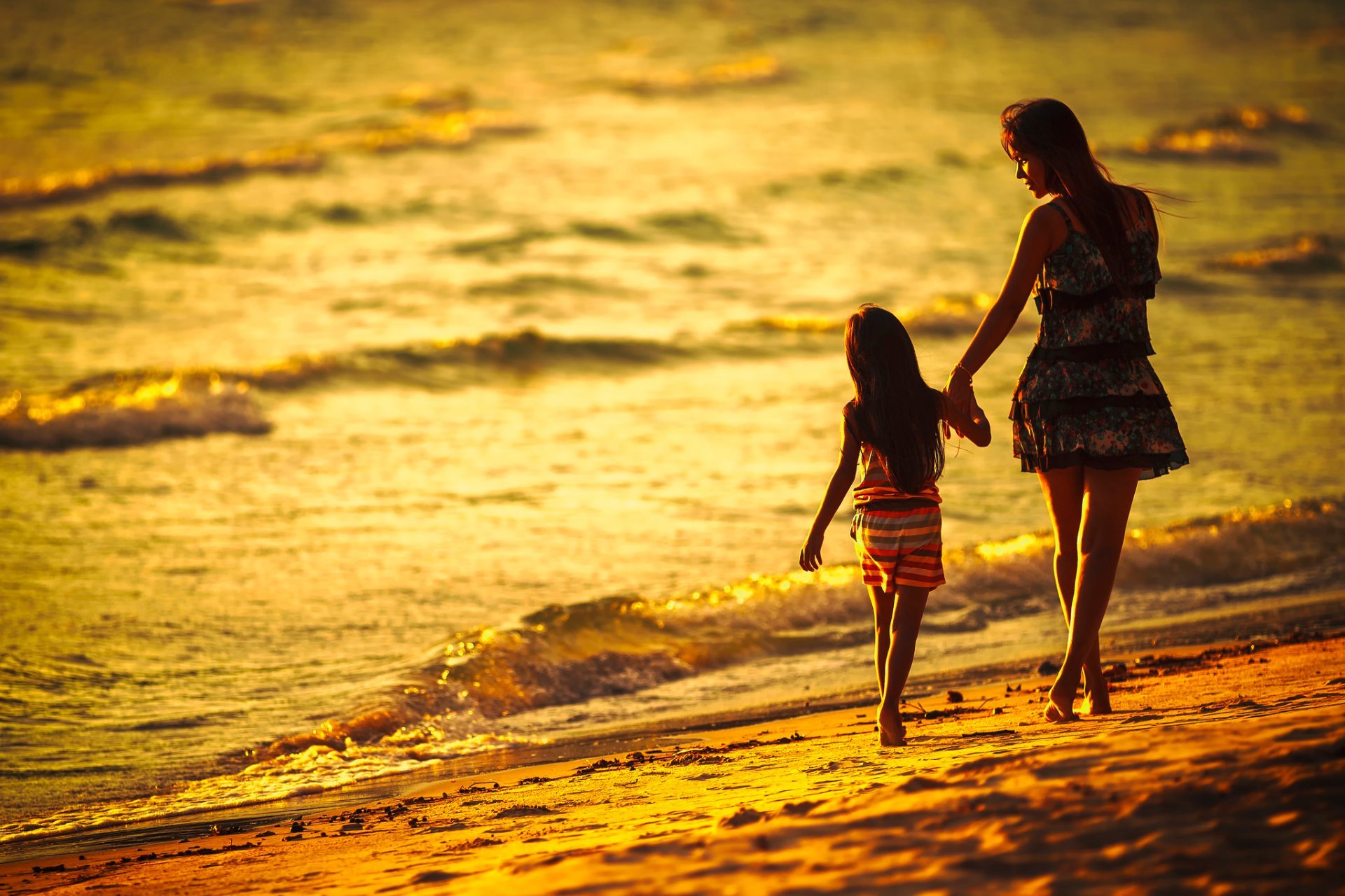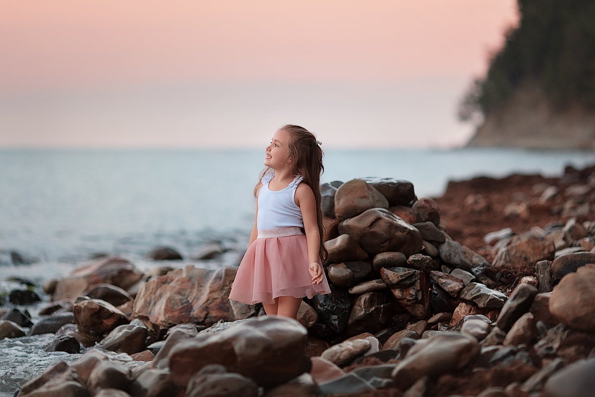 На картинке изображен ребенок, стоящий на берегу моря во время заката. На фоне красивого оранжевого неба и отражения солнца на воде создается умиротворенная атмосфера. Ребенок внимательно смотрит на заходящее солнце, словно погруженный в размышления или восторг. Этот момент запечатлен на фотографии, передавая тепло и спокойствие всем, кто смотрит на это прекрасное природное явление.