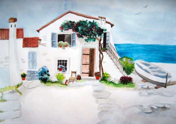 Домик у моря акварель