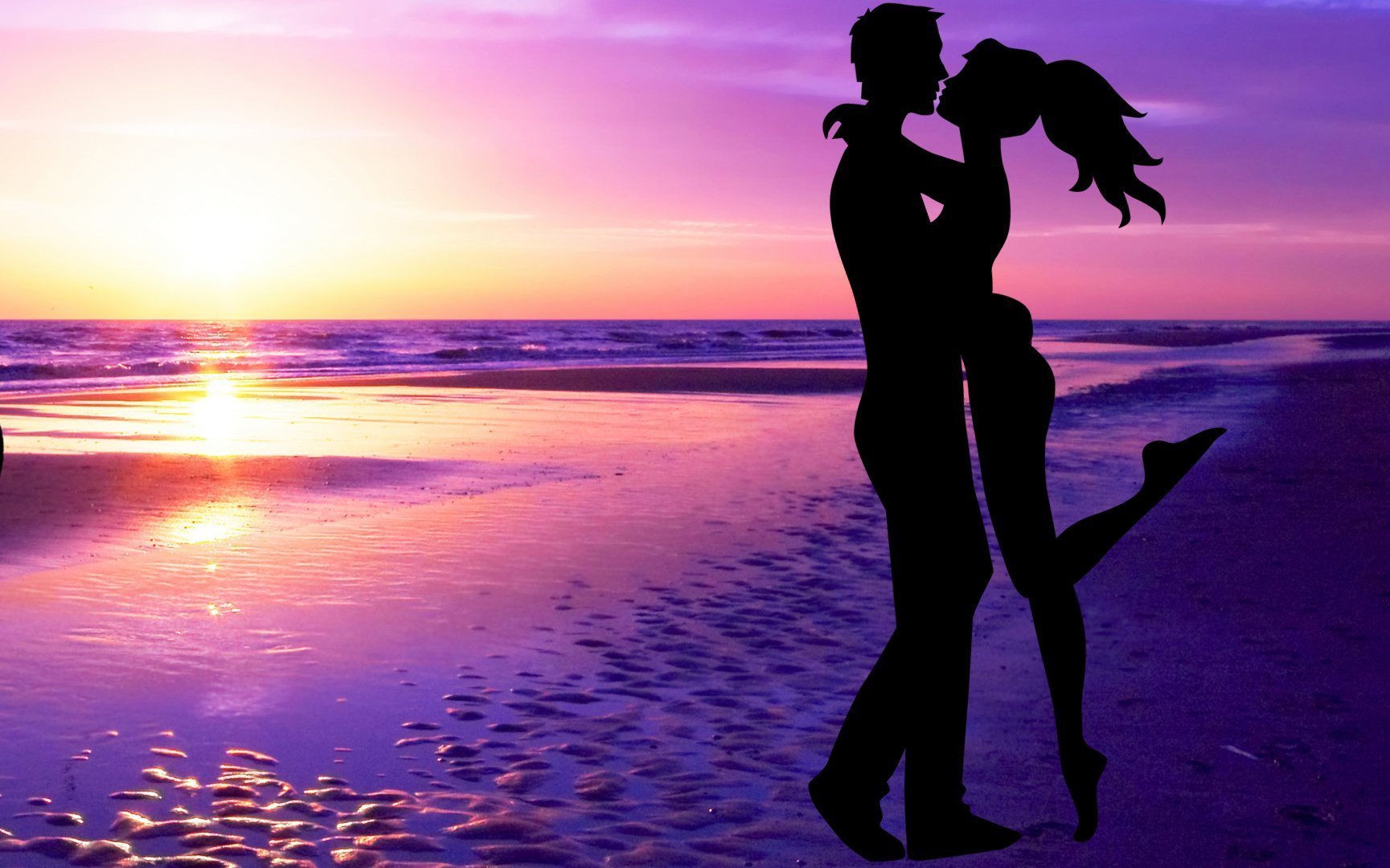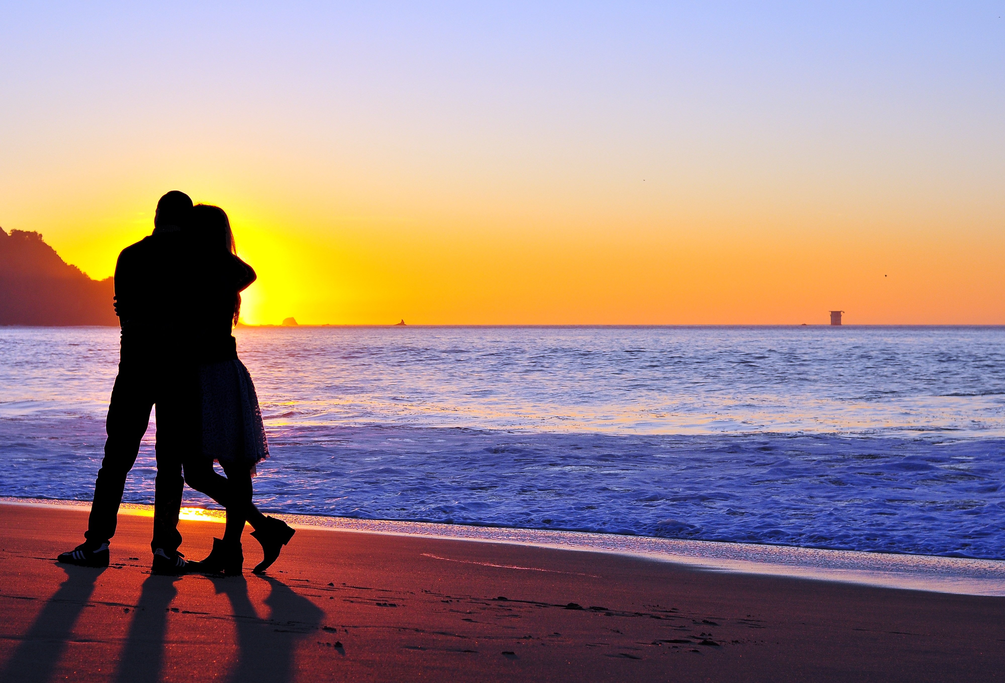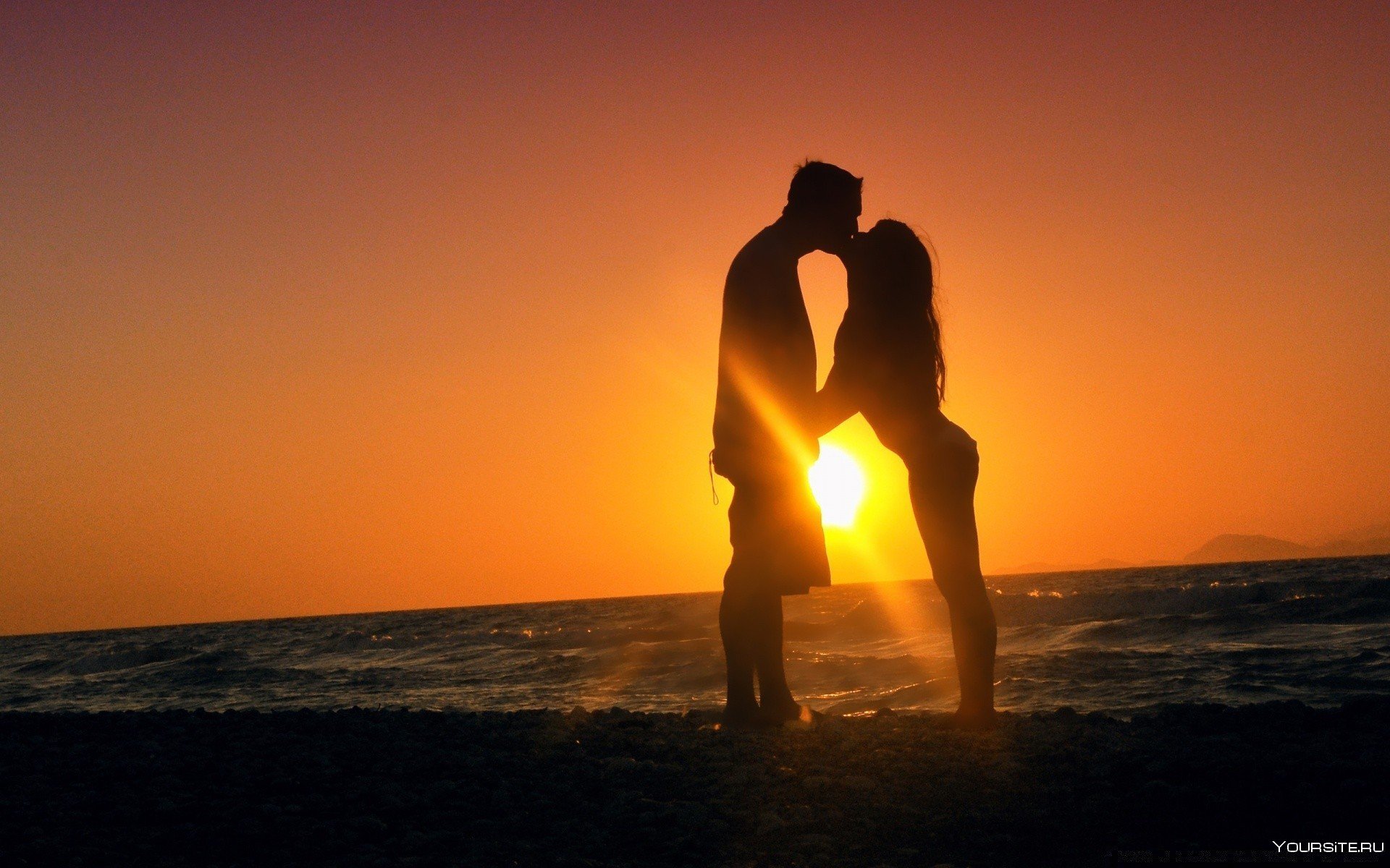 ![Влюбленные на закате на берегу]()