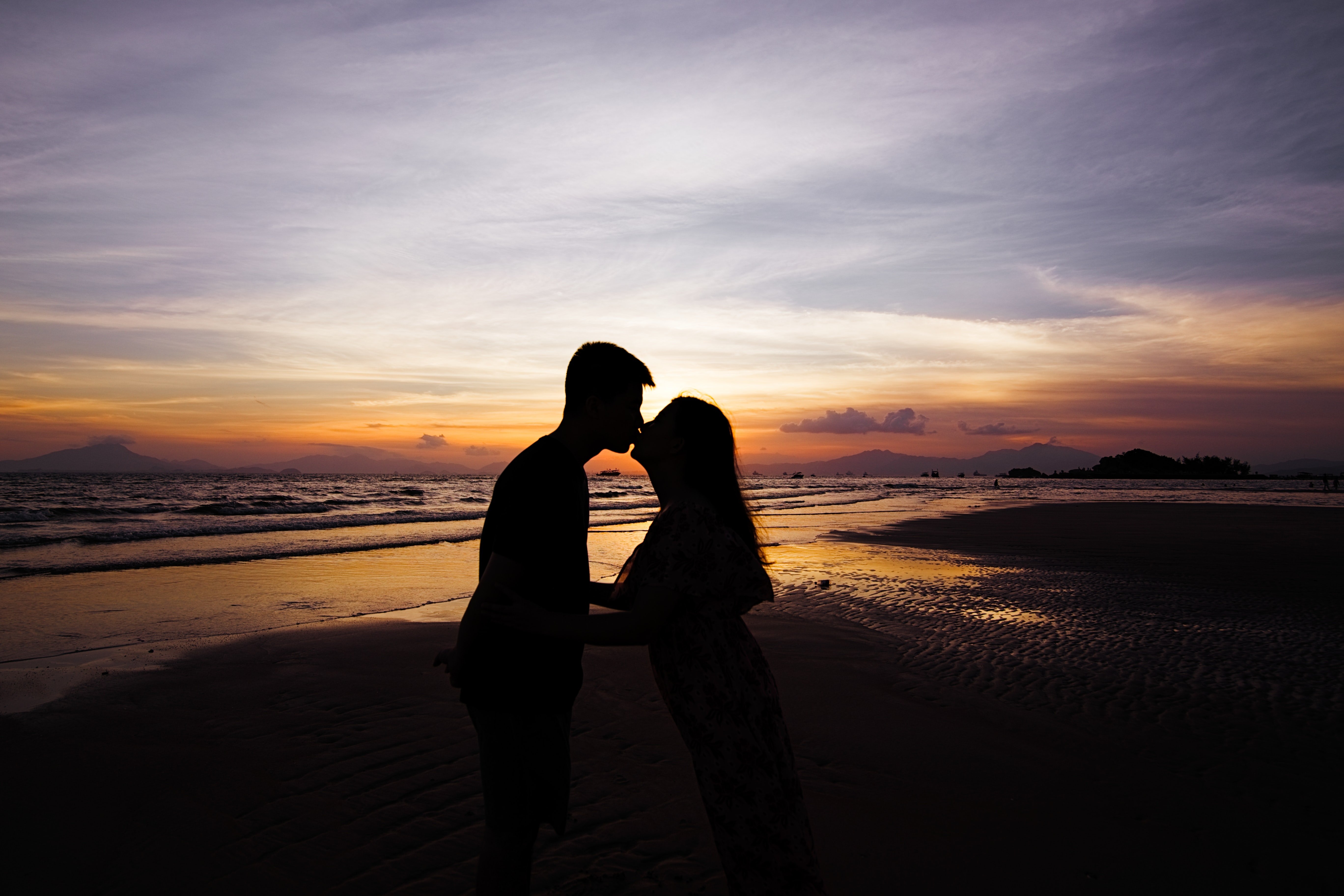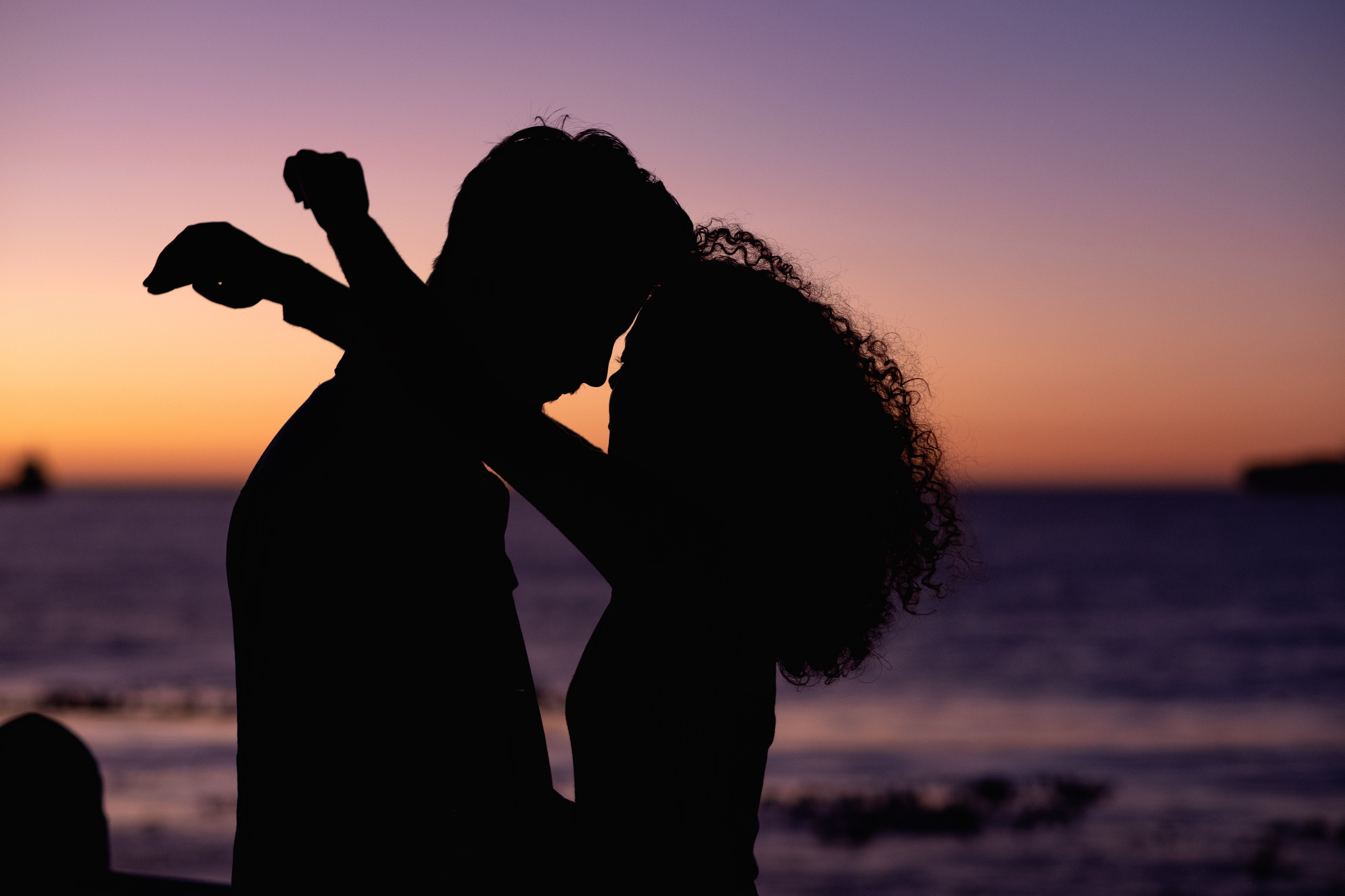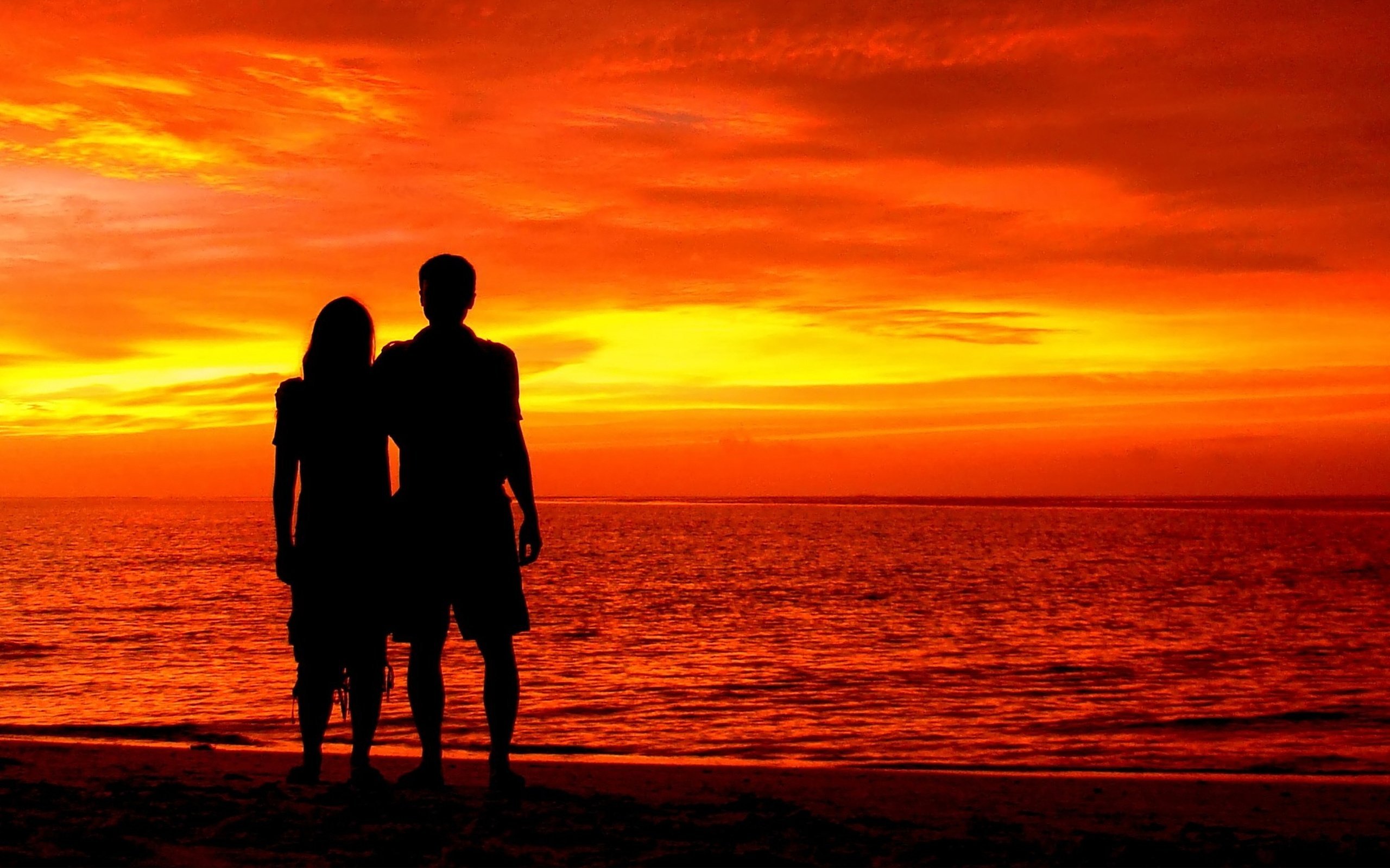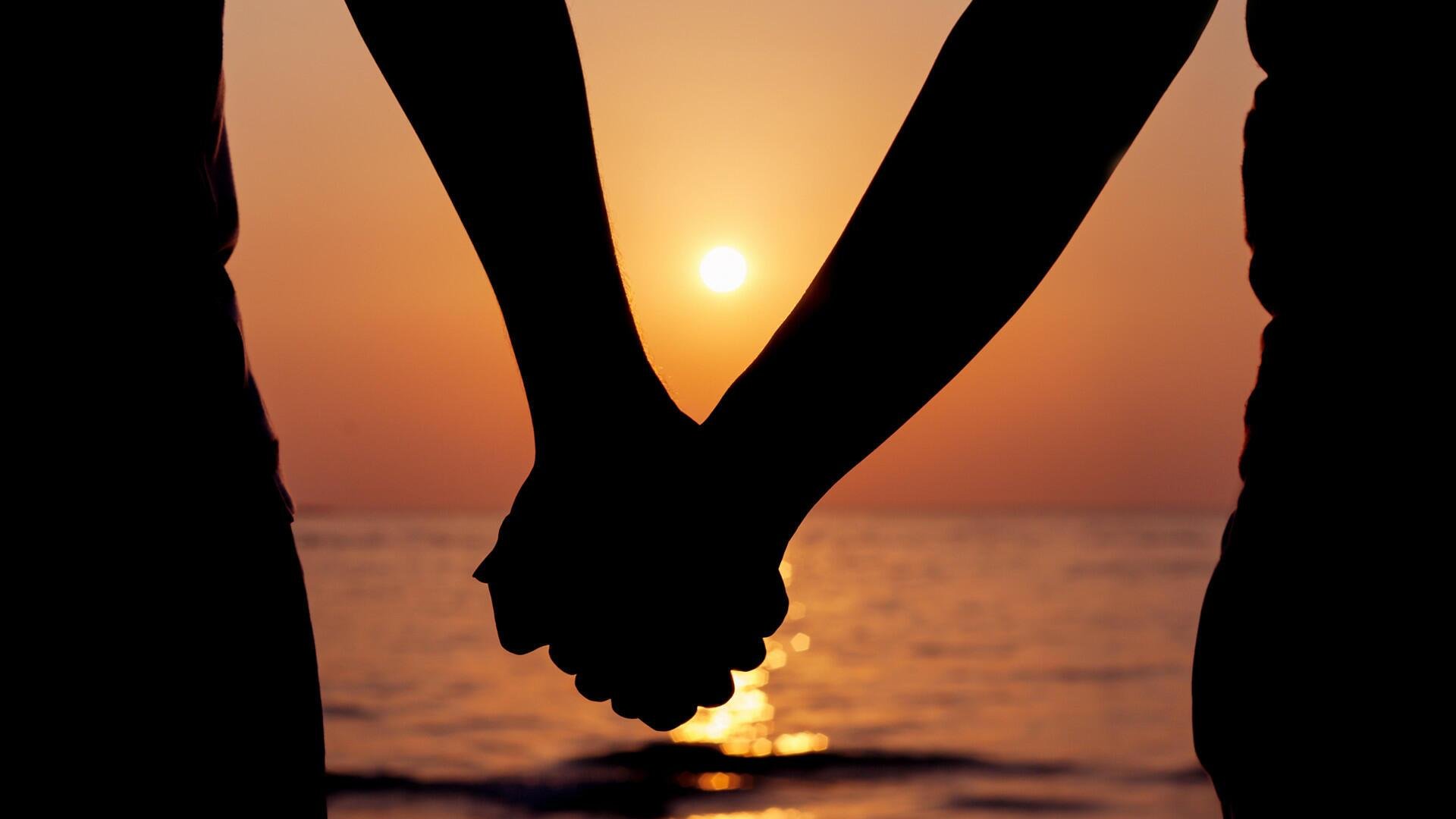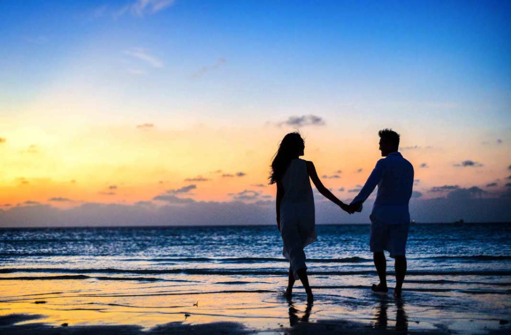 ![Пара на берегу моря на закате]()
