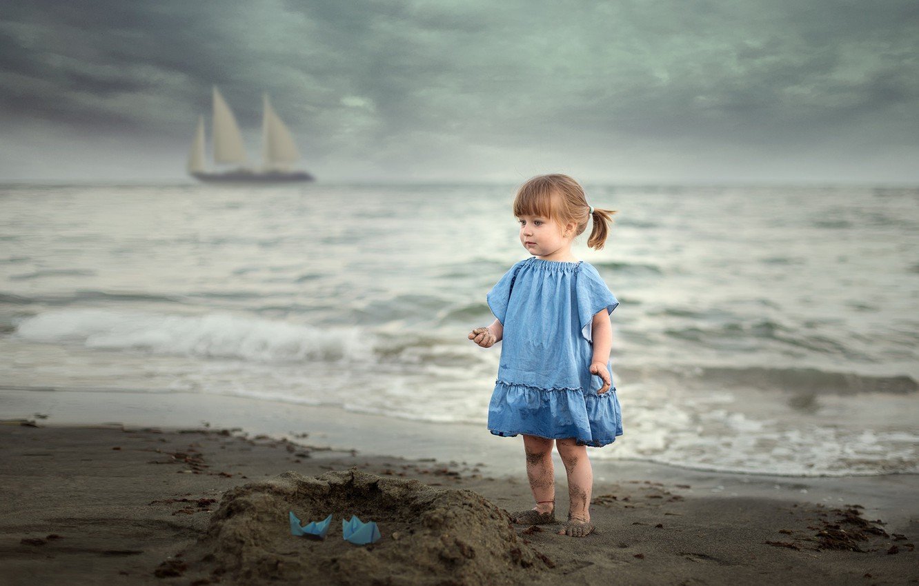 ![Ребенок сидящий возле моря]()