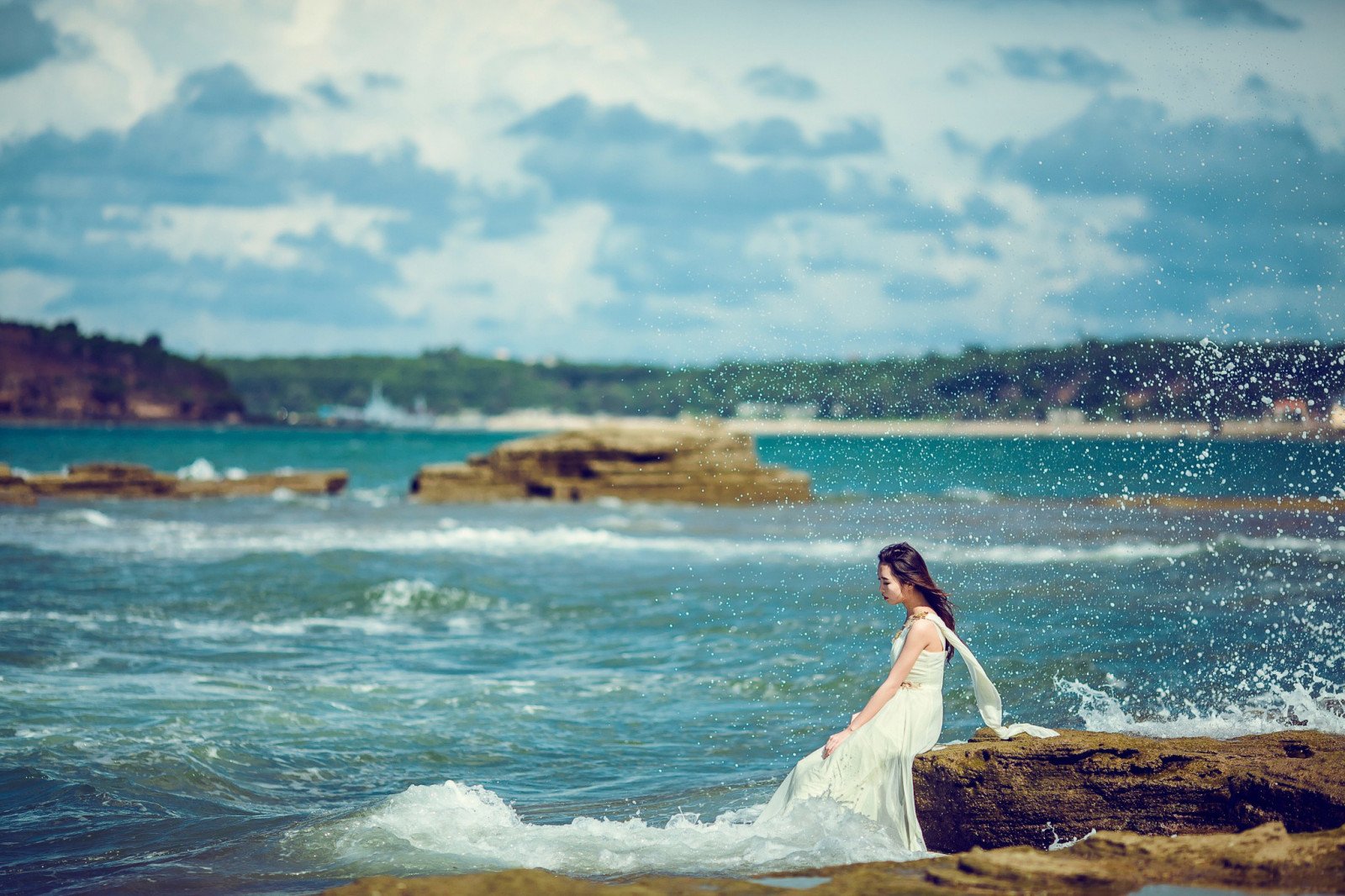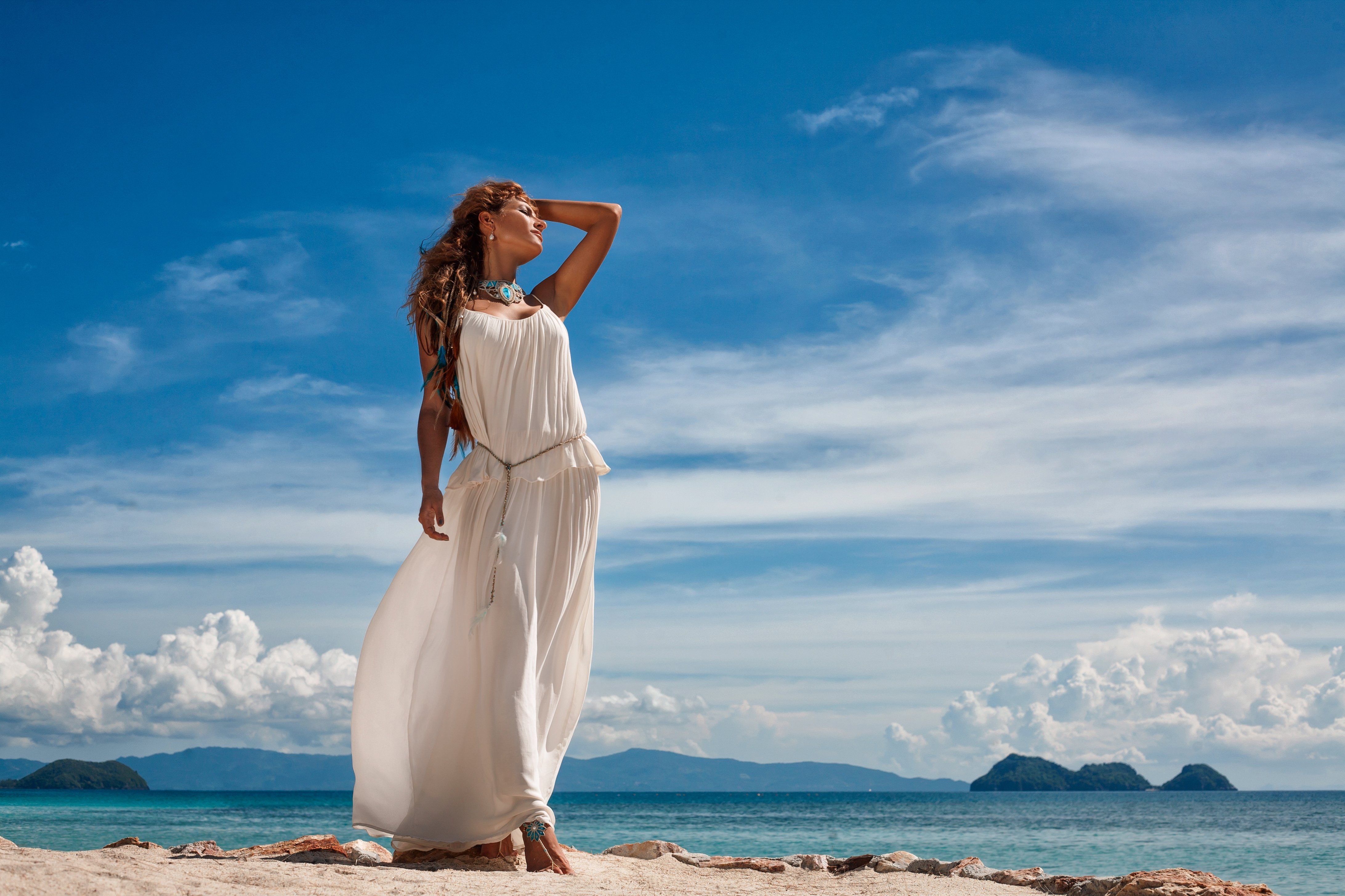 Девушка в белом платье на море