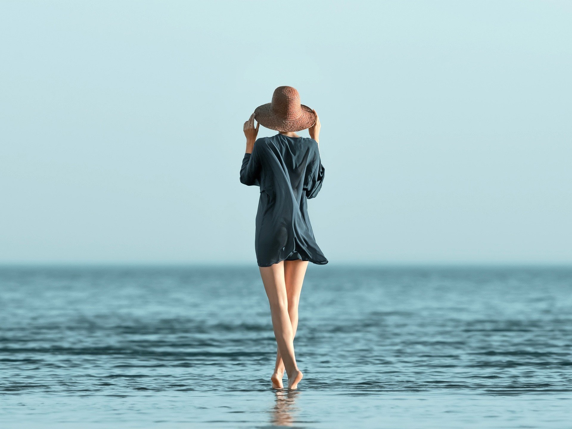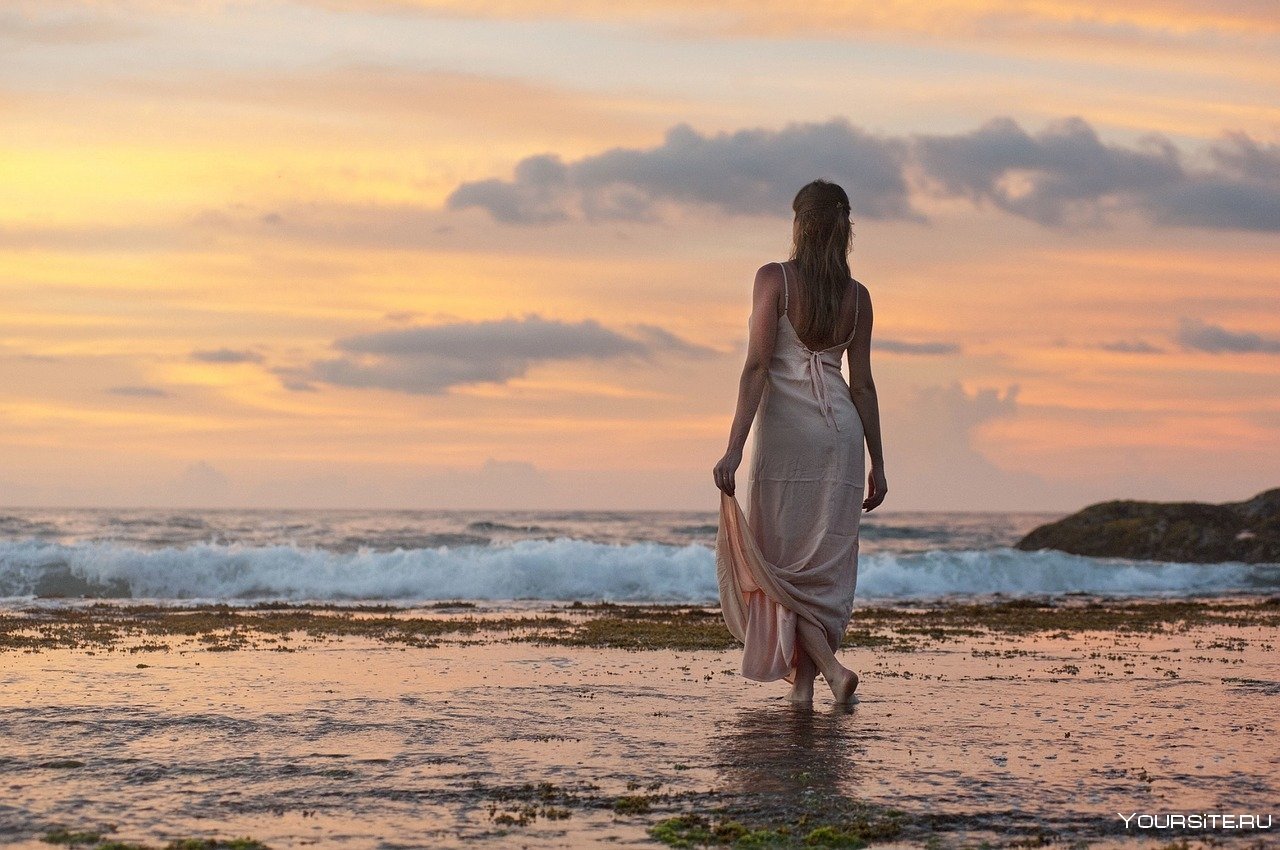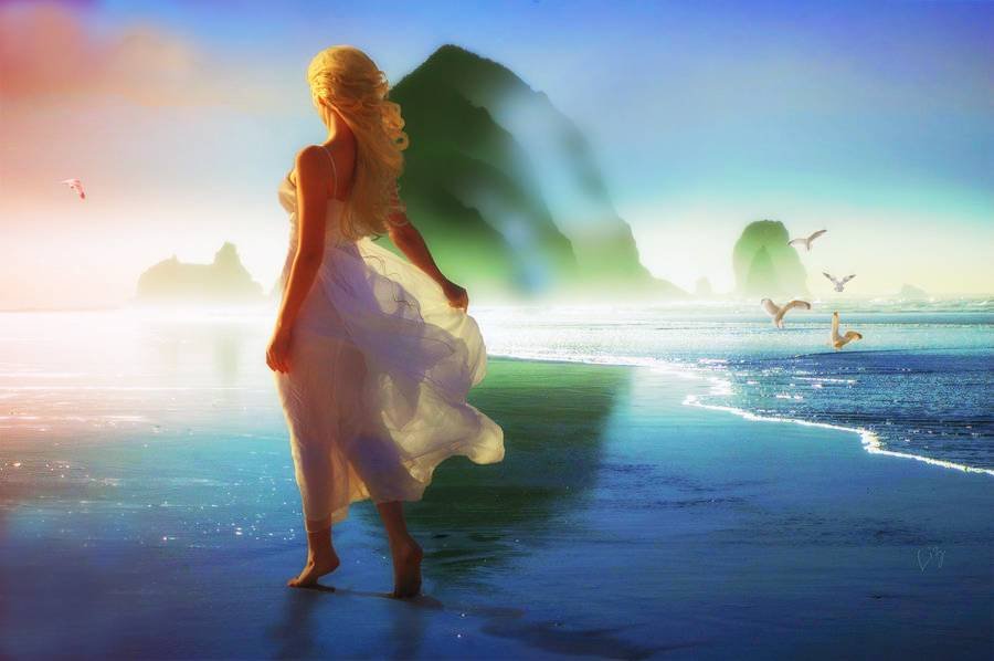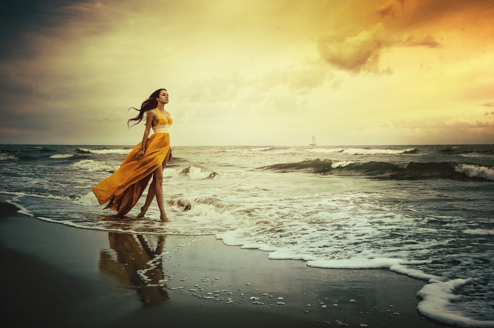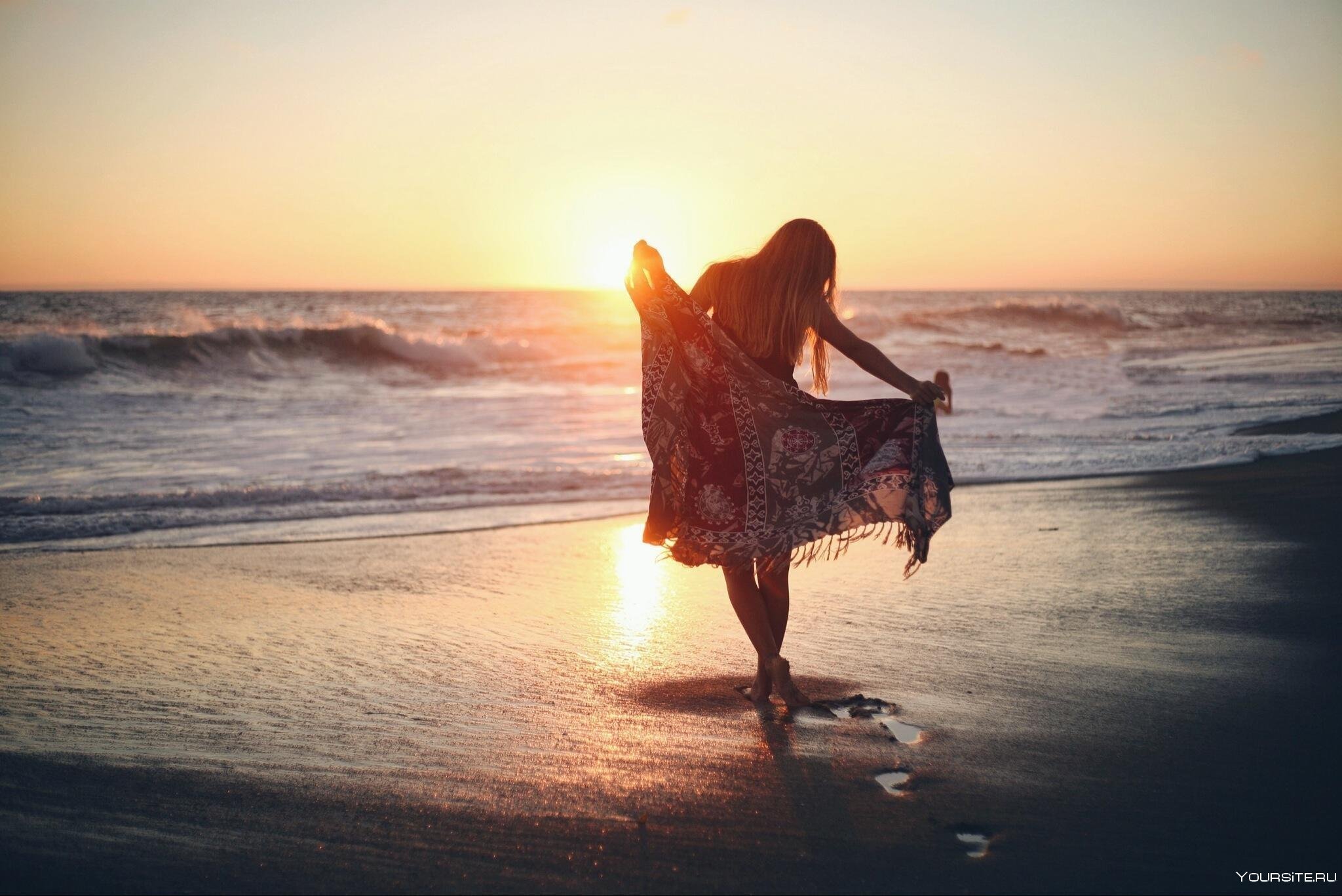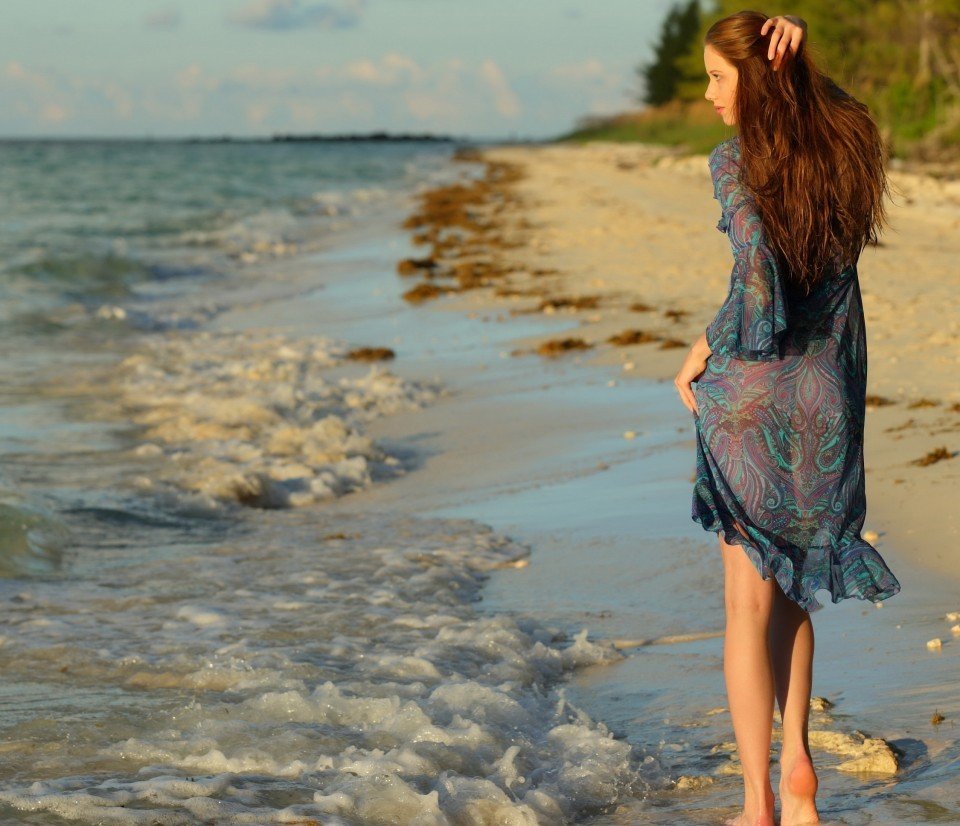 На фотографии изображена прекрасная девушка, которая грациозно идет по берегу моря. Ее волосы летят на ветру, а на заднем плане виднеется бескрайнее голубое море и небо. Взгляд девушки устремлен вдаль, словно она мечтает о чем-то важном и недостижимом. Атмосфера спокойствия и свободы, которая царит на этой картинке, словно приглашает зрителя отправиться в увлекательное путешествие за горизонт.
