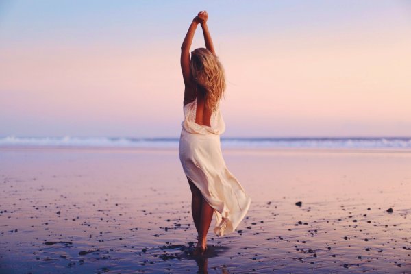 ![Девушка танцует на берегу]()