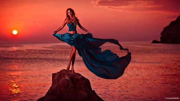 ![Девушка в синем платье у моря]()