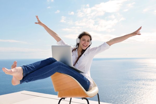 ![Девушка с ноутбуком на море]()