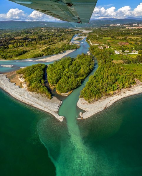 На картинке изображено потрясающее естественное явление — река, впадающая в море. Величественные воды реки плавно сливаются с бескрайними просторами морской глади. Этот удивительный момент запечатлен на фотографии, передавая красоту и гармонию природы. Вода реки и моря создают неповторимую картину, наполняя сердце спокойствием и восторгом от окружающего мира.