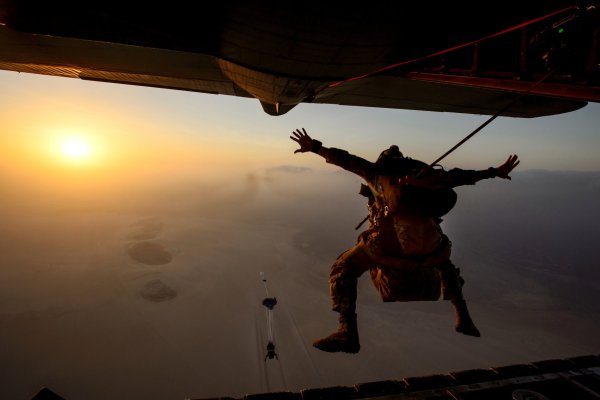 ![Десантники прыгают с парашютом]()