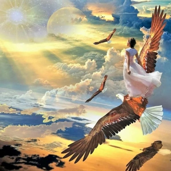 На картинке изображено небо, в котором кружатся птицы, а на переднем плане виден человек. Этот яркий и динамичный сюжет символизирует свободу, легкость и гармонию с природой. Птицы, парящие в воздухе, могут олицетворять мечты, стремление к высотам и новым горизонтам, а человек на фоне этого образа добавляет элемент человеческого взгляда на окружающий мир. Эта композиция может вдохновить зрителя на размышления о взаимосвязи человека с природой, о красоте окружающего мира и о бесконечных возможностях, которые открываются перед нами каждый день.
