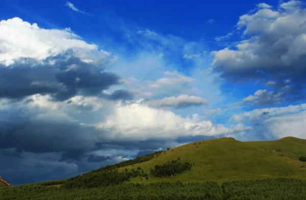 На фоне яркого голубого неба раскинулся живописный холм, покрытый зелёной травой и разноцветными цветами. Изображение пропитано спокойствием и красотой природы, создавая атмосферу умиротворения и вдохновения. Величественные облака на фоне ясного неба дополняют картину, добавляя игру света и тени на холме, что делает сцену ещё более живописной и привлекательной для взгляда.