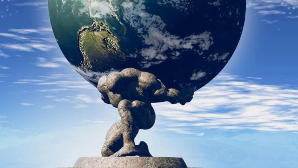Мужчина держит планету на плечах