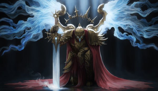 На картинке воин небеса изображен во всей своей мощи и величии, обрамленный облаками и сияющим светом. Его взгляд полон решимости и силы, а его поза выражает готовность к защите и борьбе. Небесный воин символизирует силу духа, борьбу за правду и справедливость, а также защиту небесных просторов от зла. Картина воплощает в себе эпическую тему и восхищает своей красотой и героизмом, напоминая нам о вечной борьбе добра и зла.