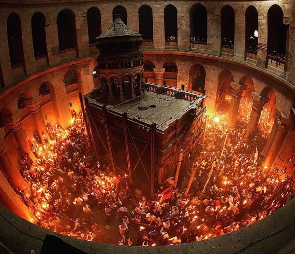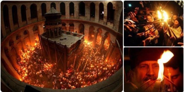 ![Благодатный огонь на Пасху в Иерусалиме]()