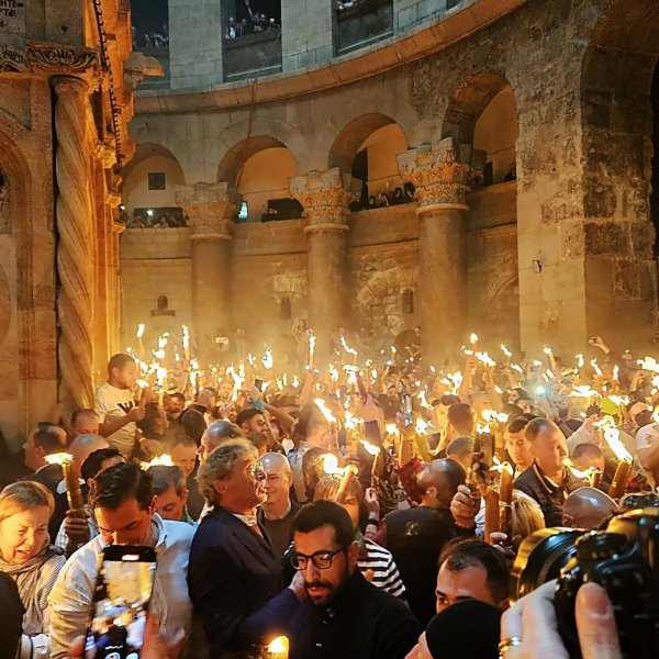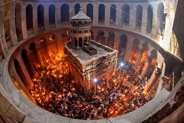 ![Благодатный огонь на Пасху в Иерусалиме]()