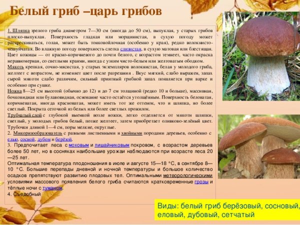 Белый гриб, или боровик, это один из самых популярных видов съедобных грибов, который обитает в различных экосистемах по всему миру. Эти грибы отличаются нежным вкусом и ароматом, и часто используются в кулинарии. Белые грибы можно найти в лесах, на полянах и даже у дорог, обычно в середине лета и осенью. Их уникальная форма и цвет делают их прекрасными объектами для фотографий, добавляя красоты и загадочности окружающему миру.