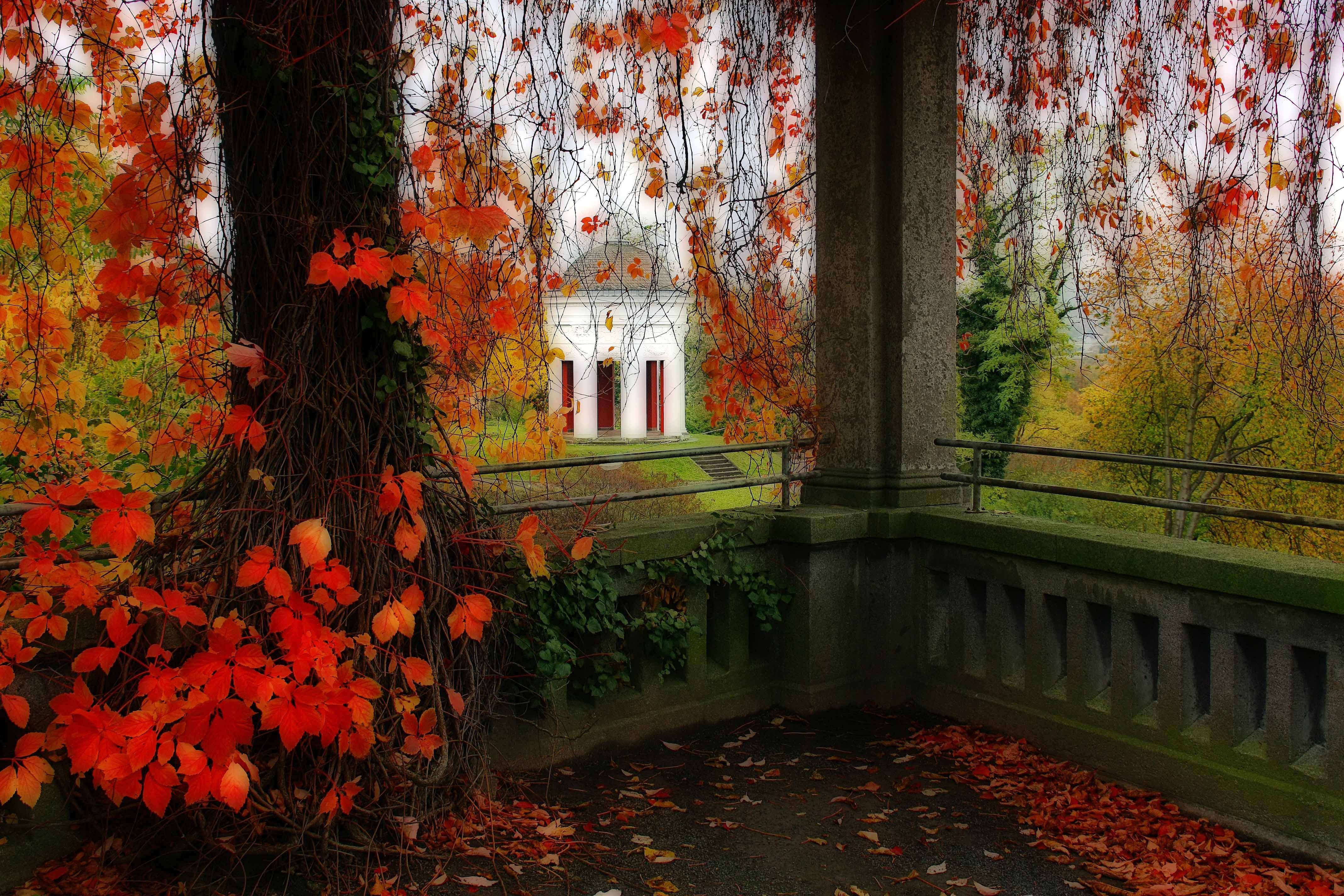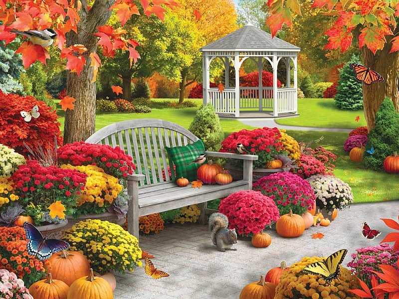 ![Осенний сад с беседкой]()