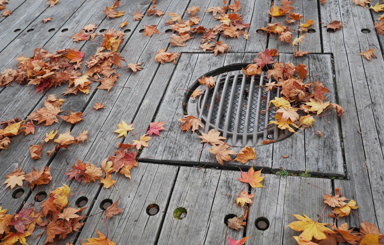 ![Листья на деревянном полу]()