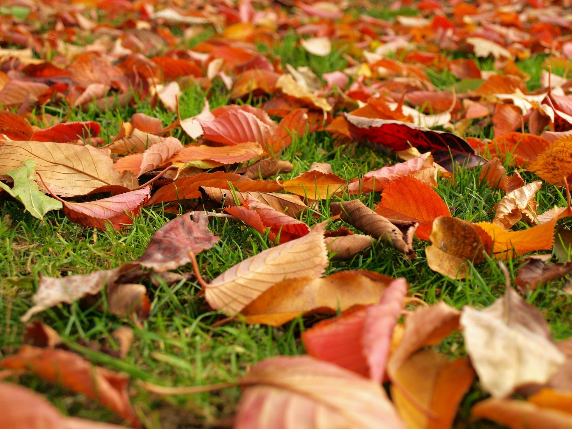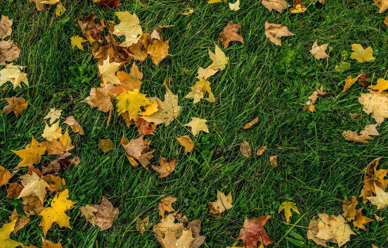 ![Осенние листья на траве]()