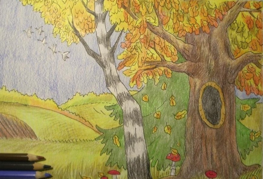 Осенний пейзаж цветными карандашами