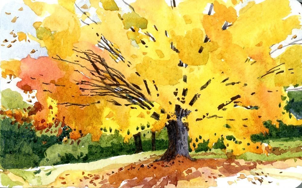 Рисование осеннего дерева акварель