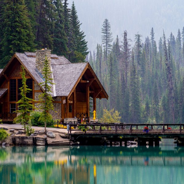 ![Хижина в лесу у озера]()