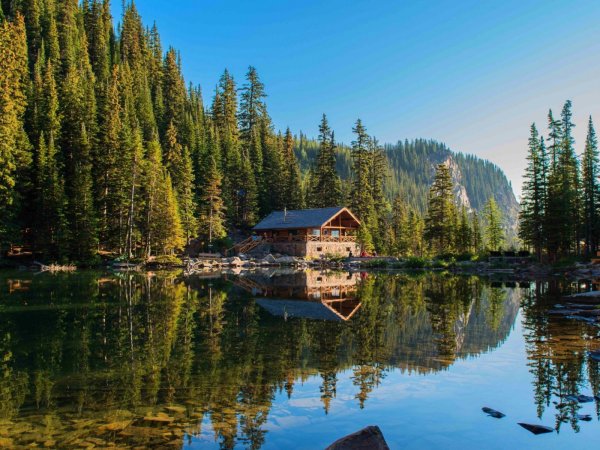 ![Хижина в лесу у озера]()