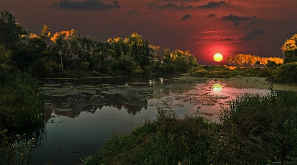 Пруд в лесу закат
