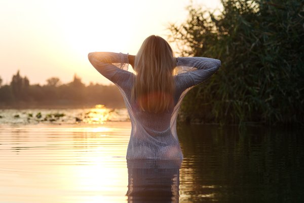 Блондинка у реки со спины