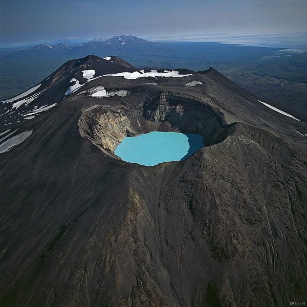 ![Вулкан Горелый кратер голубое озеро]()