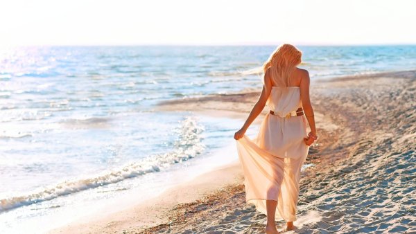 Блондинка идет по берегу моря