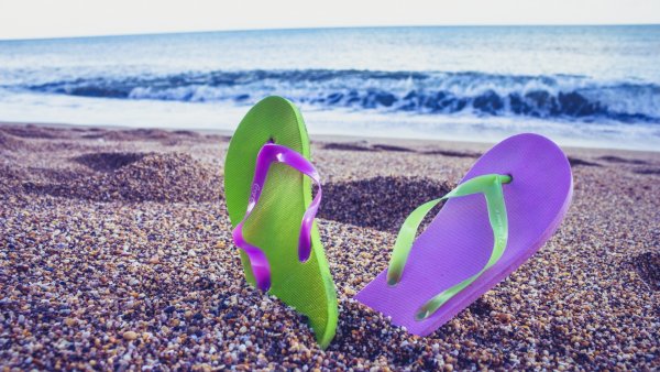 ![Пляжные тапочки на песке]()