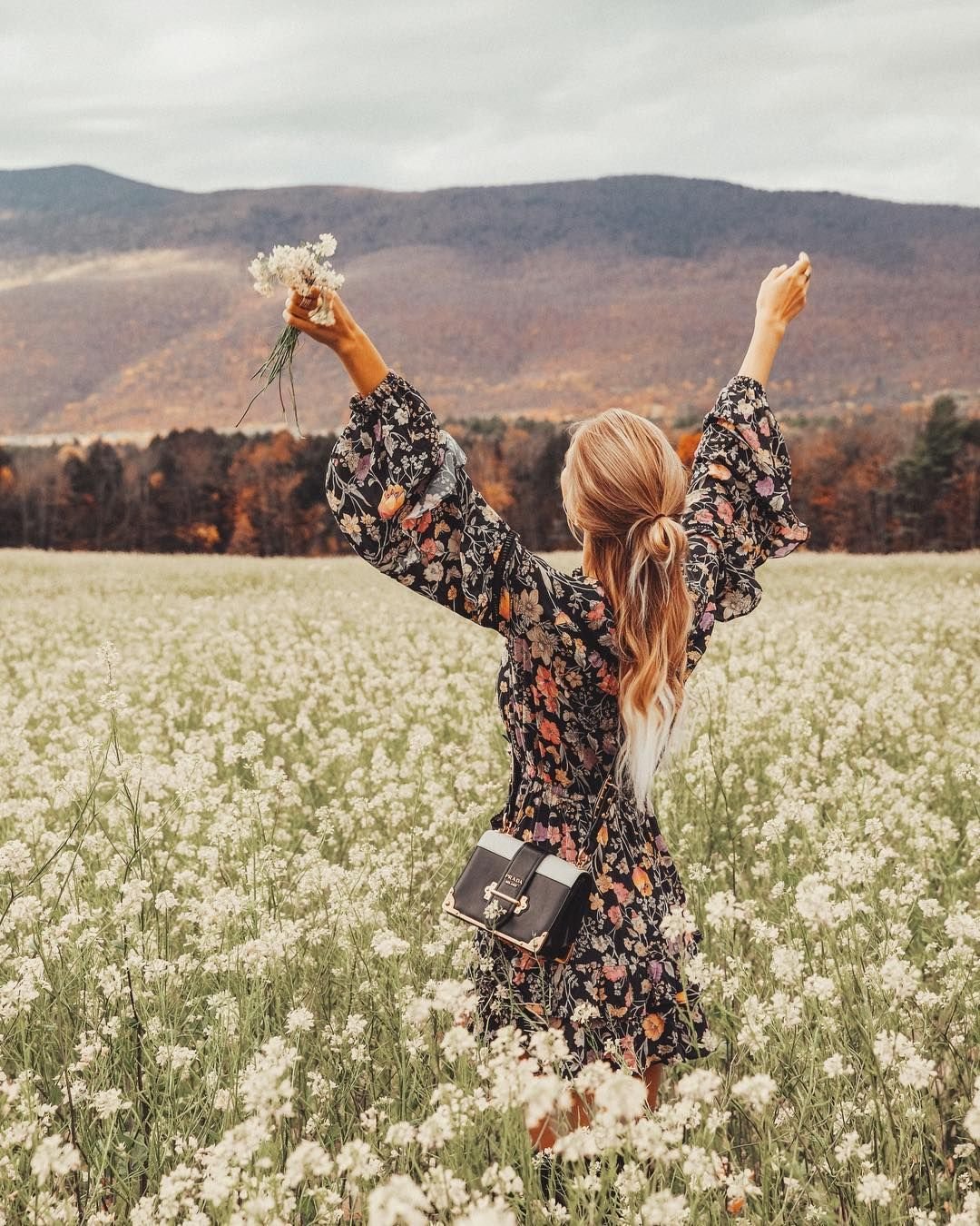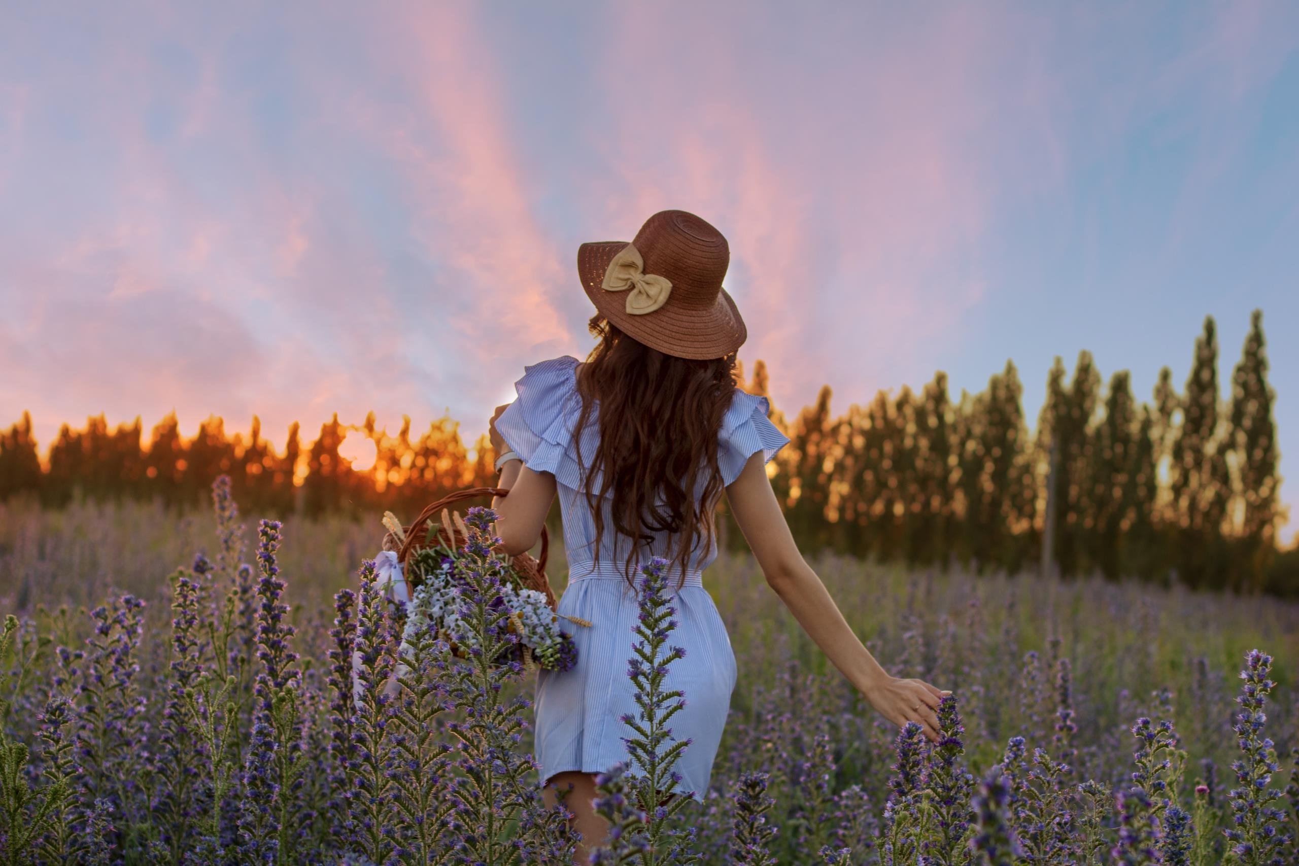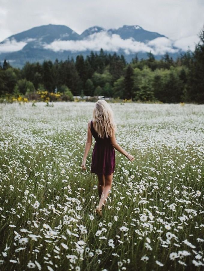Девушка в поле цветов со спины