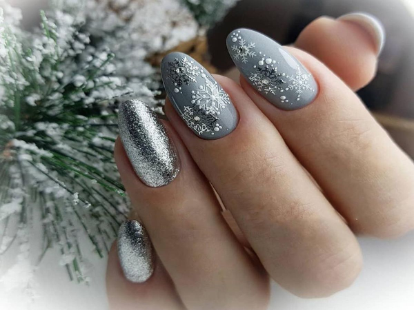 Маникюр с серебряными снежинками