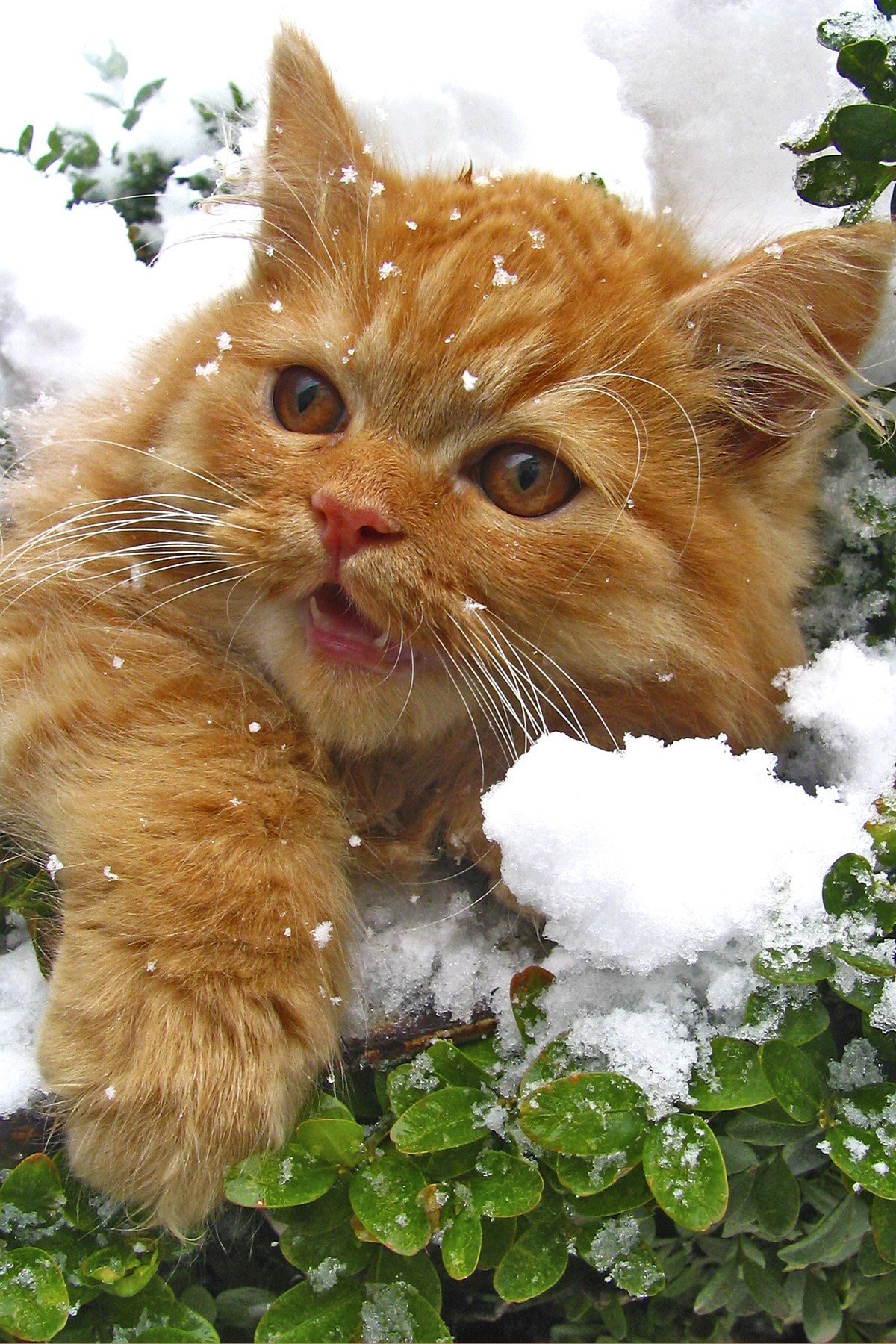 ![Рыжий кот ловит снежок]()