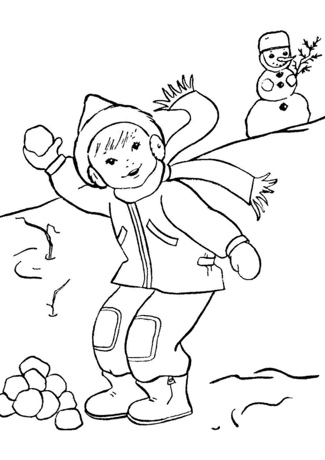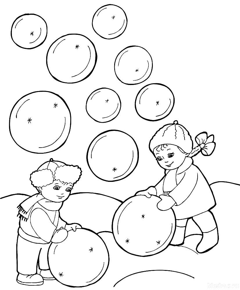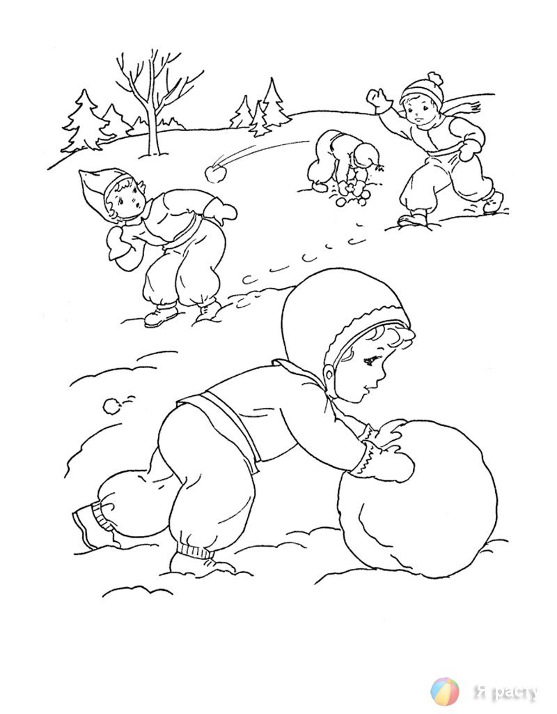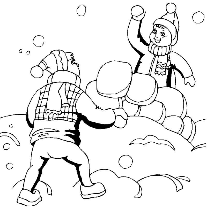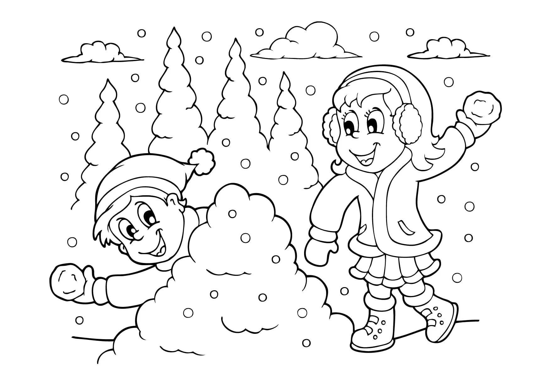 Дети играют в снежки раскраска