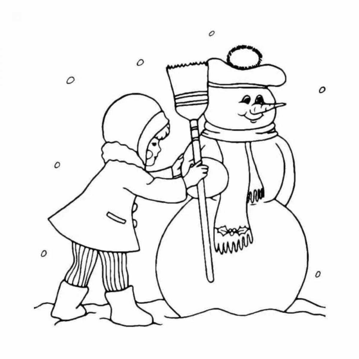 Дети лепят снеговика раскраска для детей