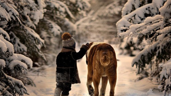 ![Мальчик с собакой зимой]()