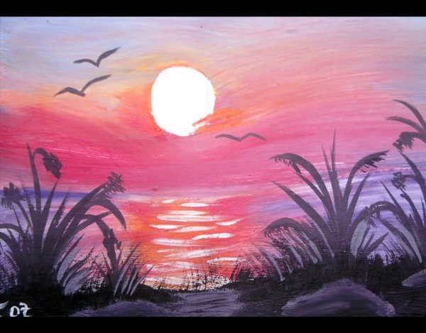 ![Закат солнца гуашью]()