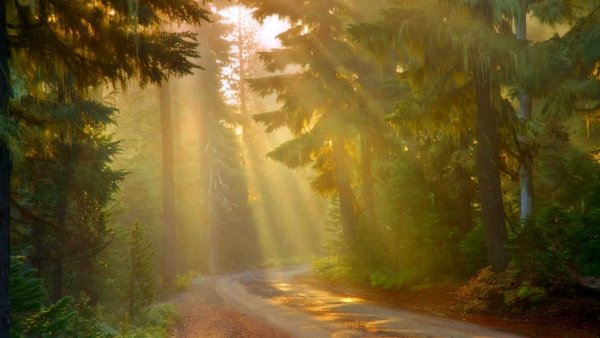![Лес дорога солнце]()