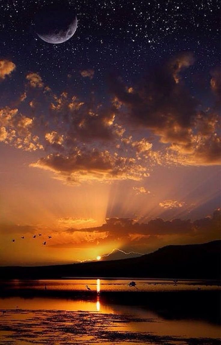![Красивый закат с луной]()