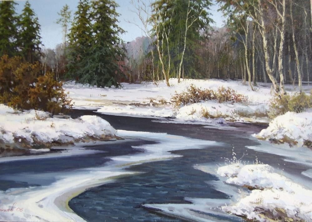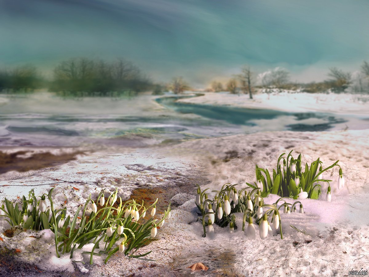Зимняя картина природы оживает перед глазами: сияющее солнце освещает белоснежные сосульки, играющие на ветках деревьев, тихий поток ручейка уже начинает пробиваться сквозь ледоход и проталины, распускаются первые подснежники. Вдали слышится пения птиц, возвещающих приход весны. Каждый элемент этой зимней панорамы создает уютное и волшебное настроение.