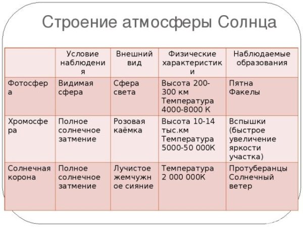 Строение атмосферы солнца таблица